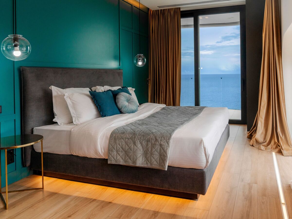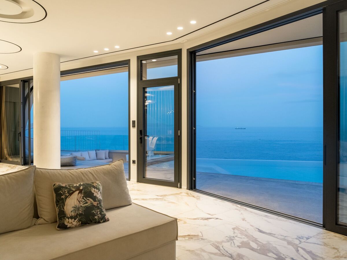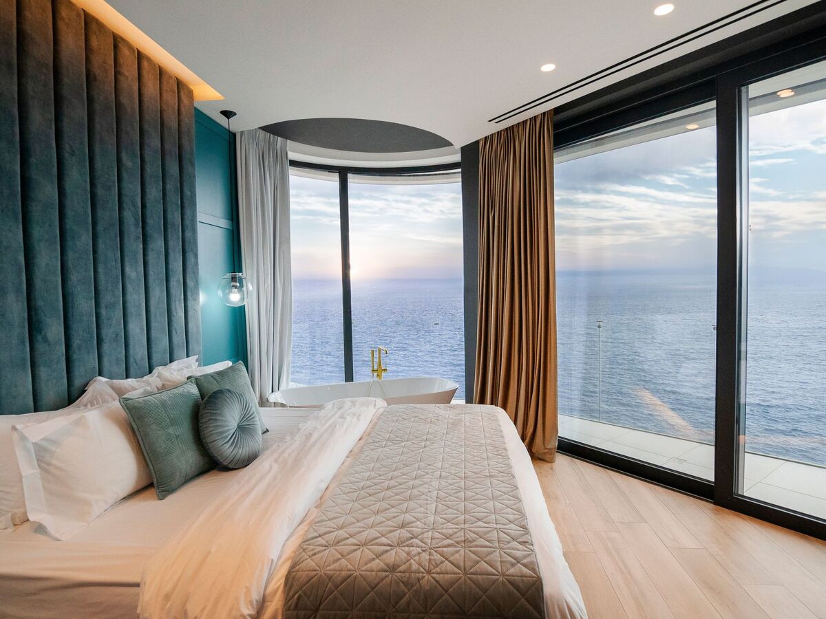 Two master bedrooms offer king-size beds, private bathrooms with luxurious bathtubs, and spectacular sea views from expansive balconies.