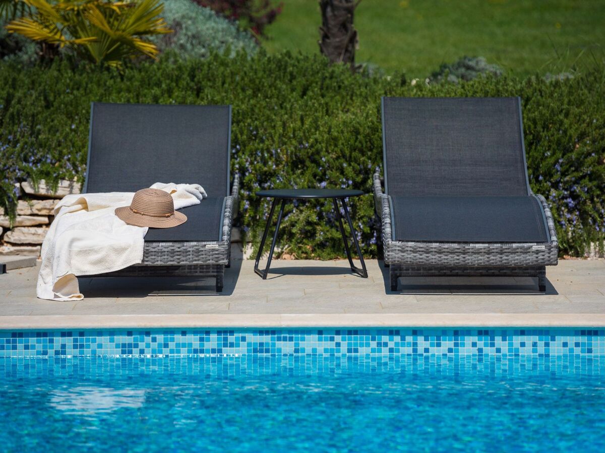 The heated pool, complemented by sunbeds, offer both privacy and direct access to nature.