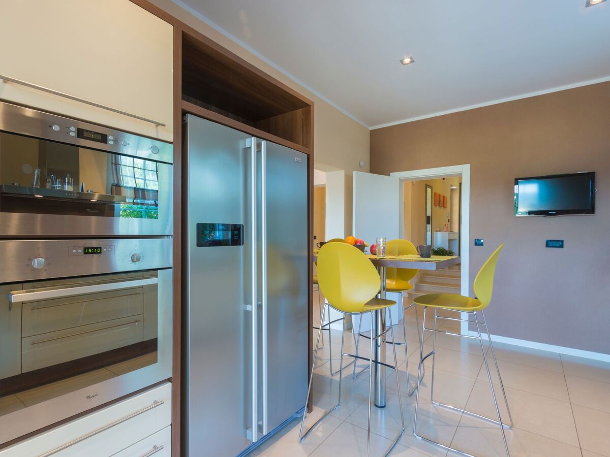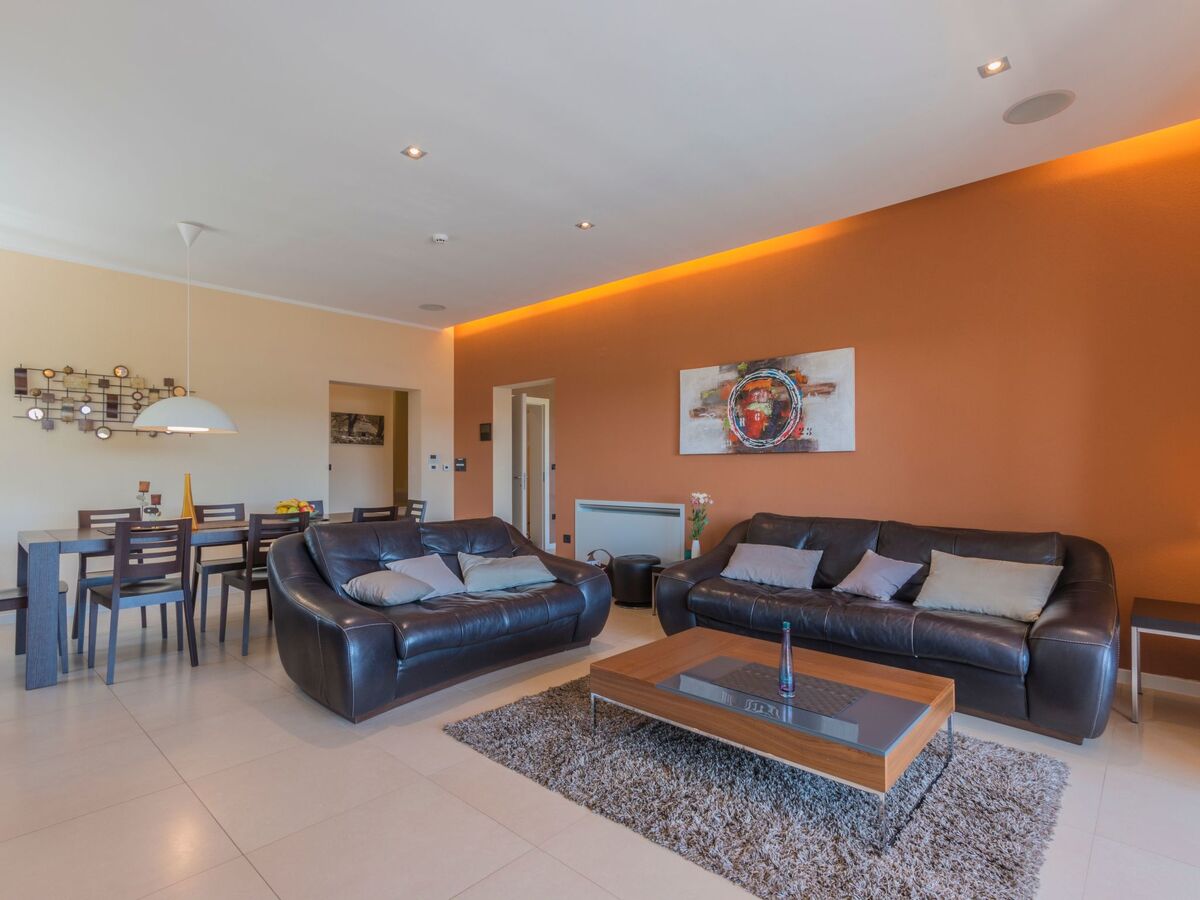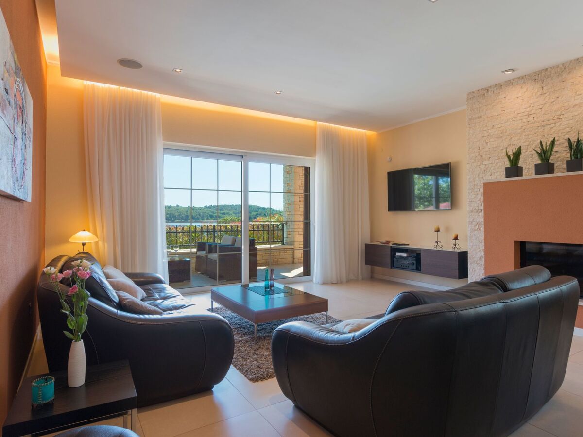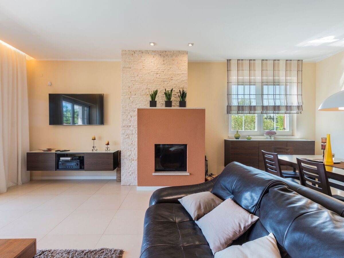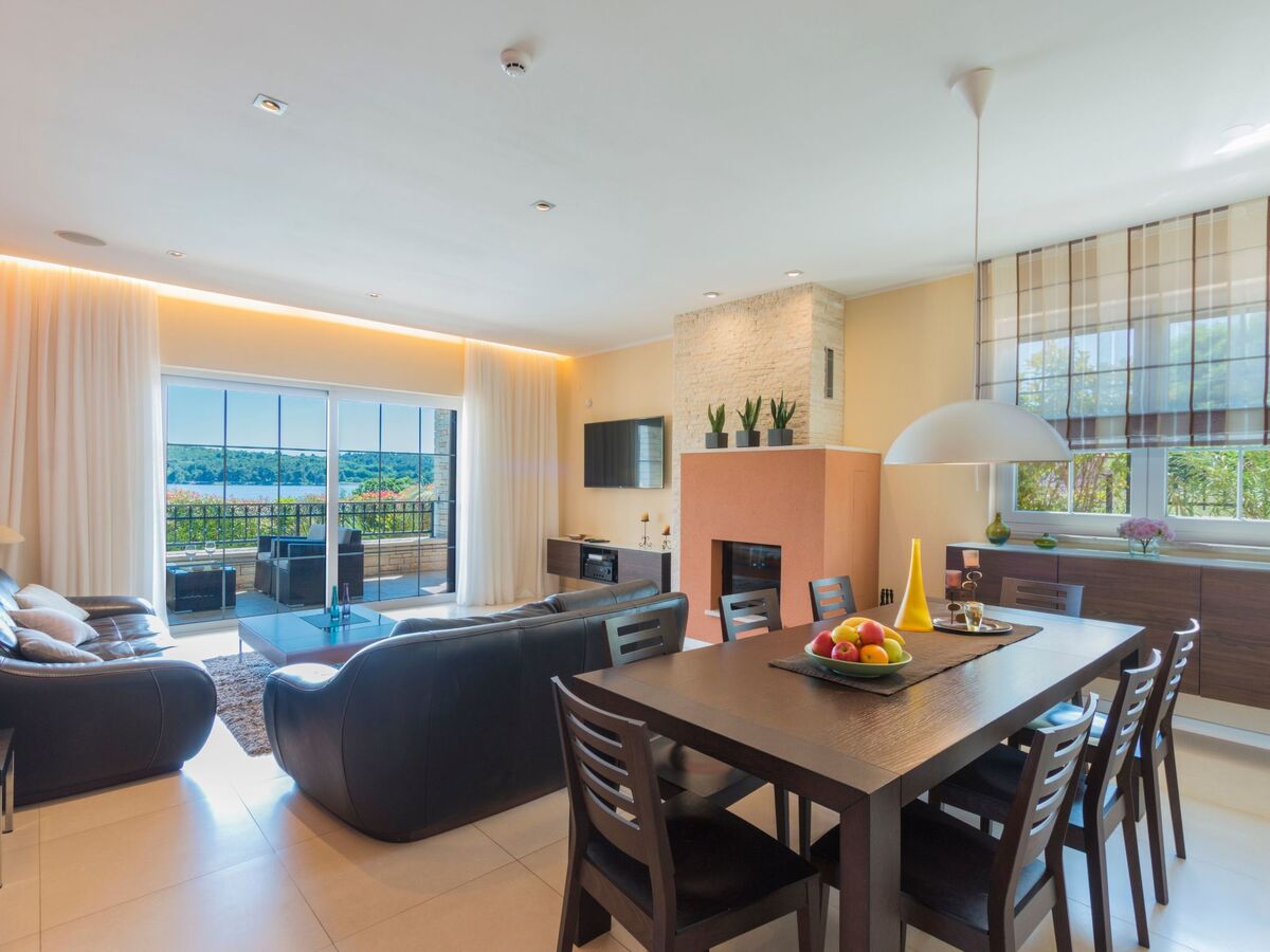 Salon- salle à manger moderne avec grande cuisine, table à manger pour 8 personnes, coin salon confortable avec cheminée, téléviseur à écran plat avec la télévision par satellite, lecteur DVD et chaîne hi-fi.