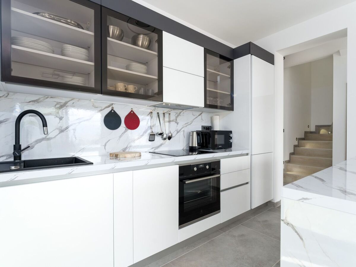 On the ground floor of the villa there is a spacious living room, a fully equipped kitchen (microwave oven, dishwasher, refrigerator with deep freezer, coffee machine) and a toilet.