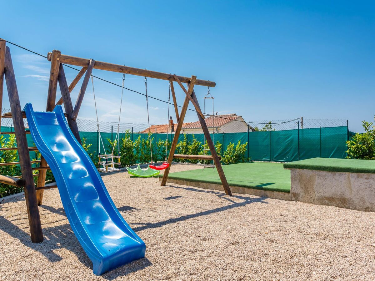 55m² pool with a lounger area and outdoor shower, as well as a children’s playground with a swing, slide and small Wendy house, where children can play to their heart’s content, while the adults make themselves comfortable on the big terrace with garden furniture, a swing and a grill.