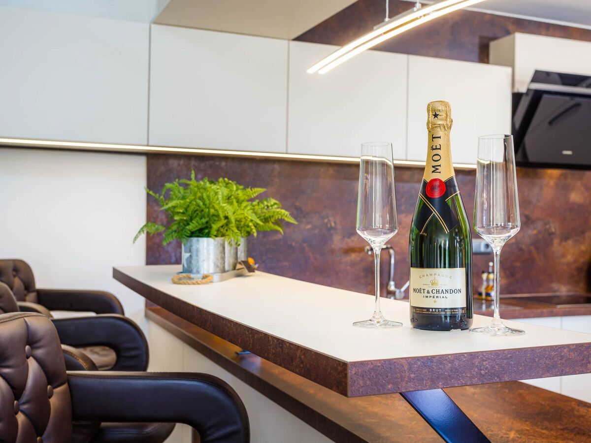 The living room comprises an open, fully-equipped kitchen with a dining space and a cosy sitting area with comfortable sofas.