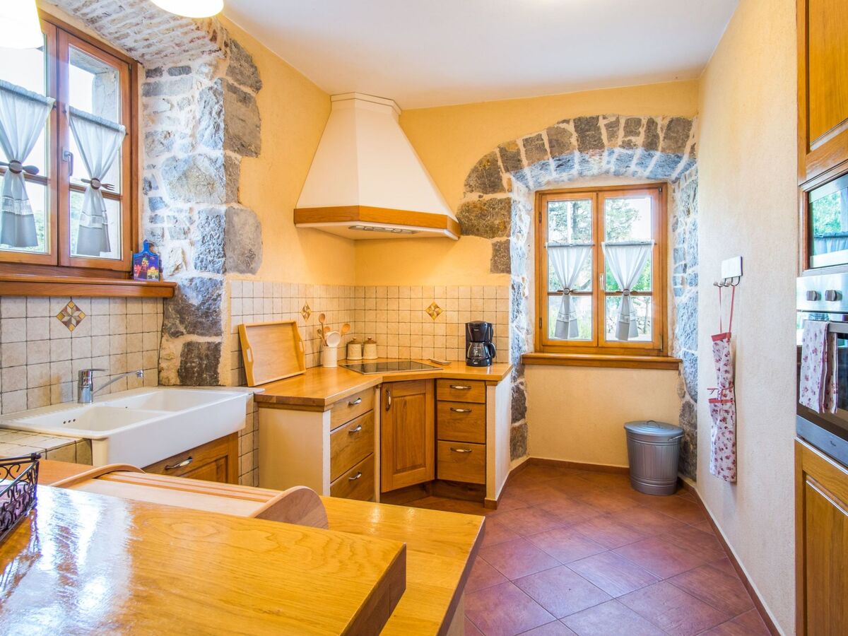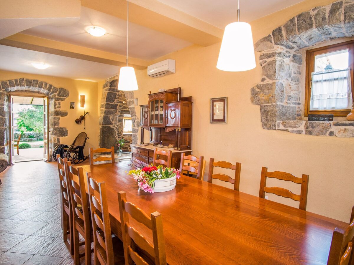 The living room has a large dining table for 10 people and the kitchen is fully equipped.