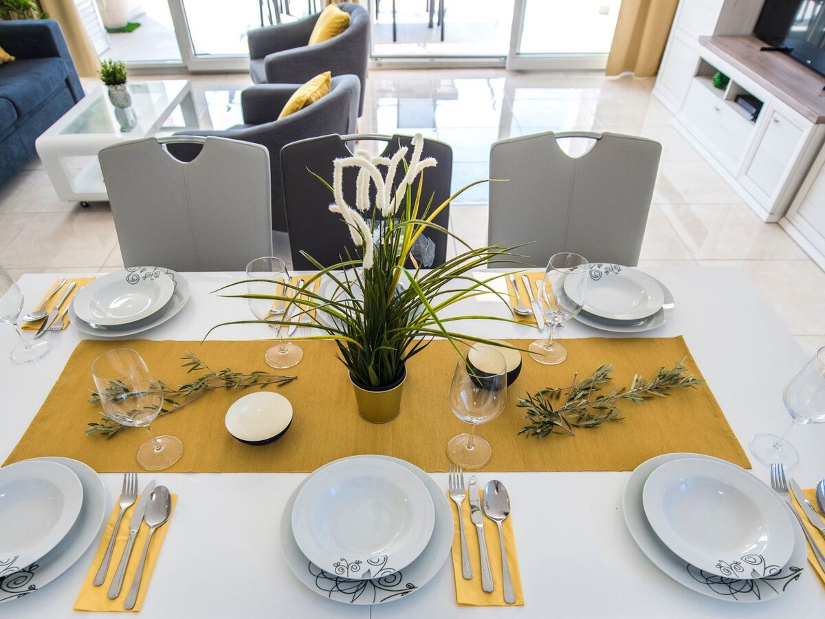 The villa’s living area exudes a warm and welcoming atmosphere, featuring plush seating, a dining area, and an array of amenities that include air conditioning throughout, a washing machine, and a dishwasher for your utmost comfort.