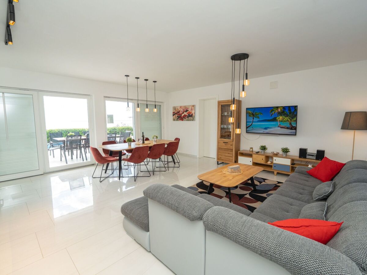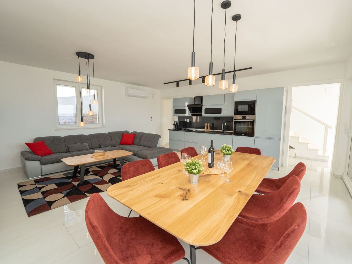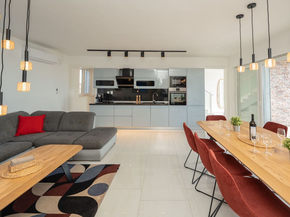 Living room connected with fully equipped kitchen, dining room, and direct access to a spacious terrace with dining area and barbecue.