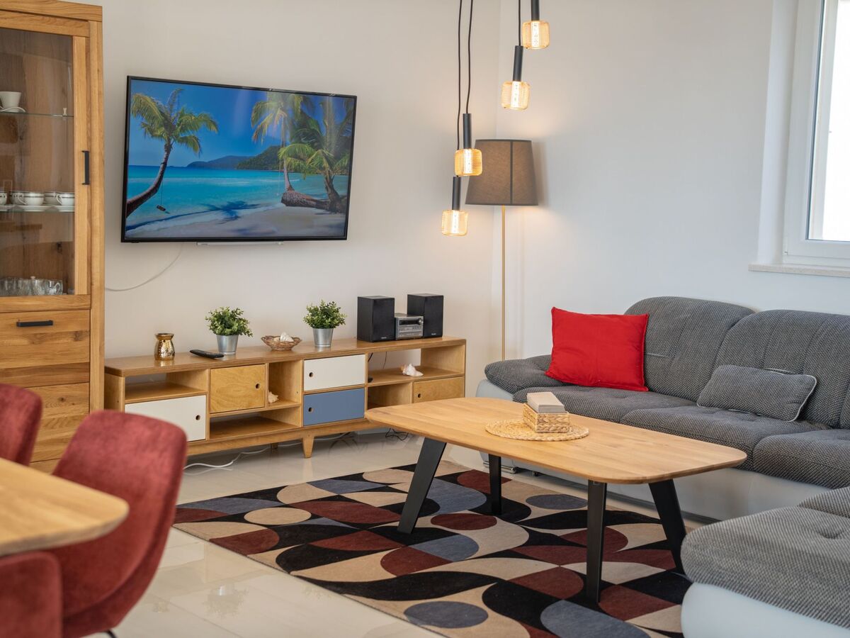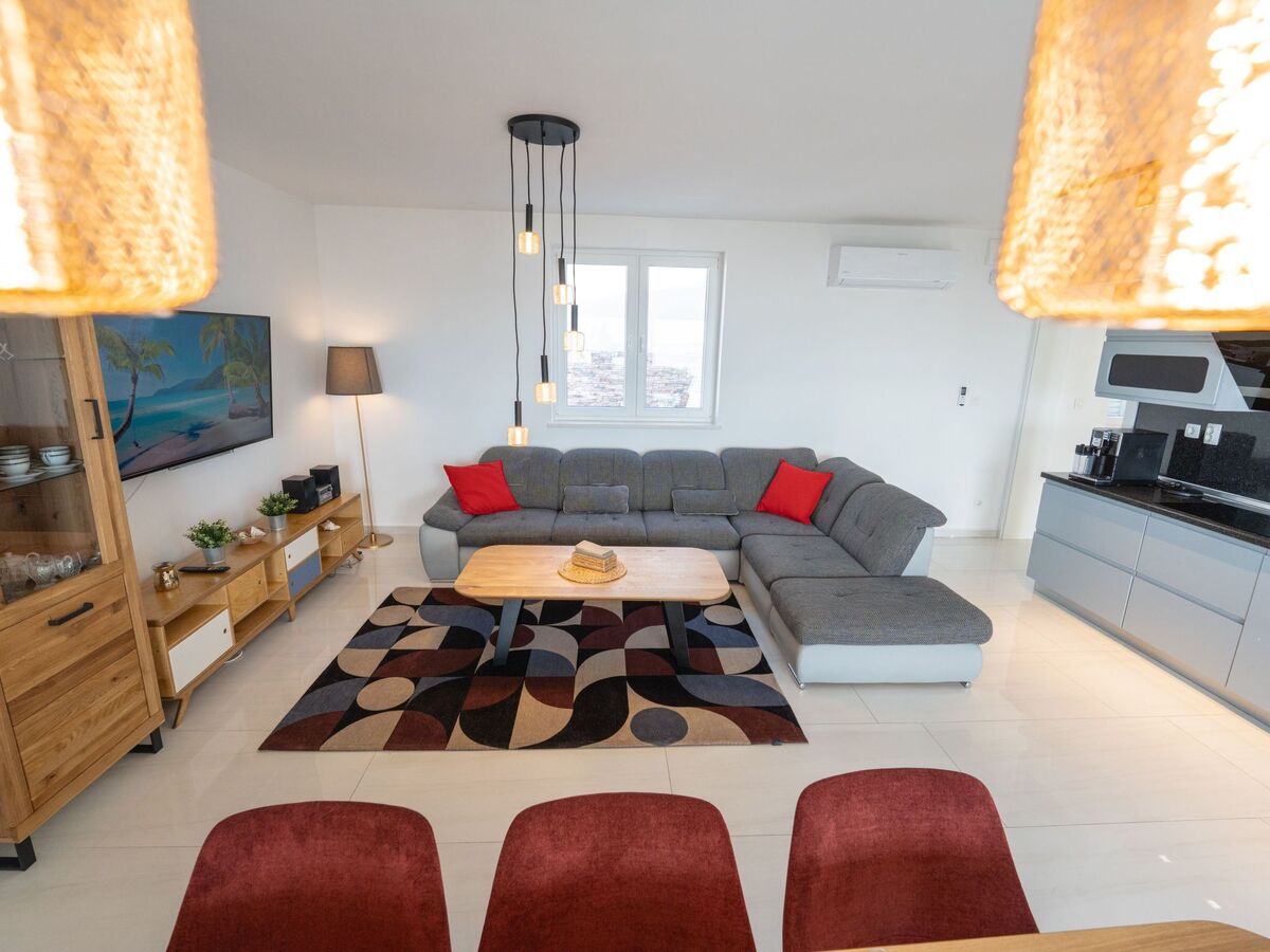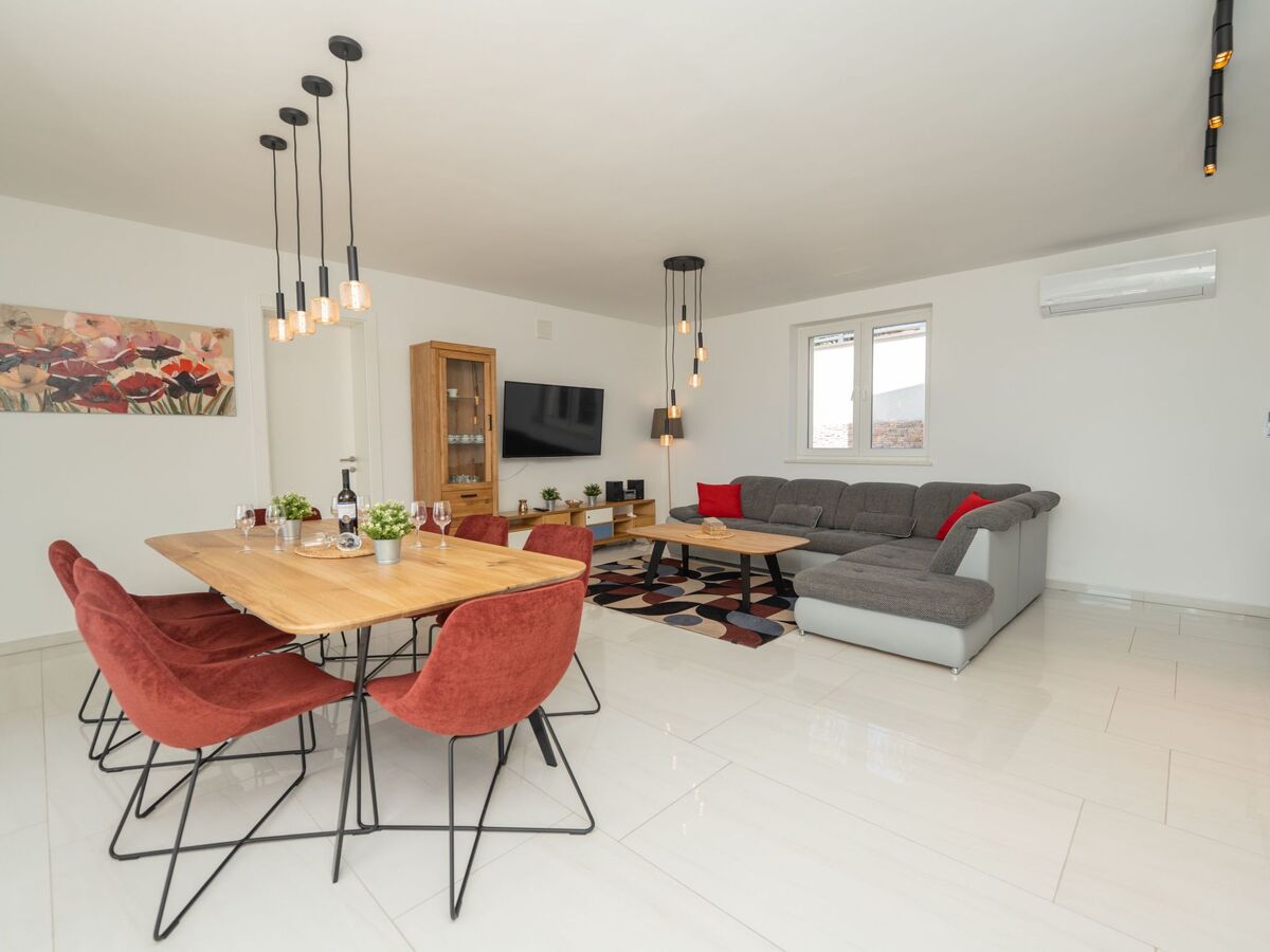 Living room connected with fully equipped kitchen, dining room, and direct access to a spacious terrace with dining area and barbecue.