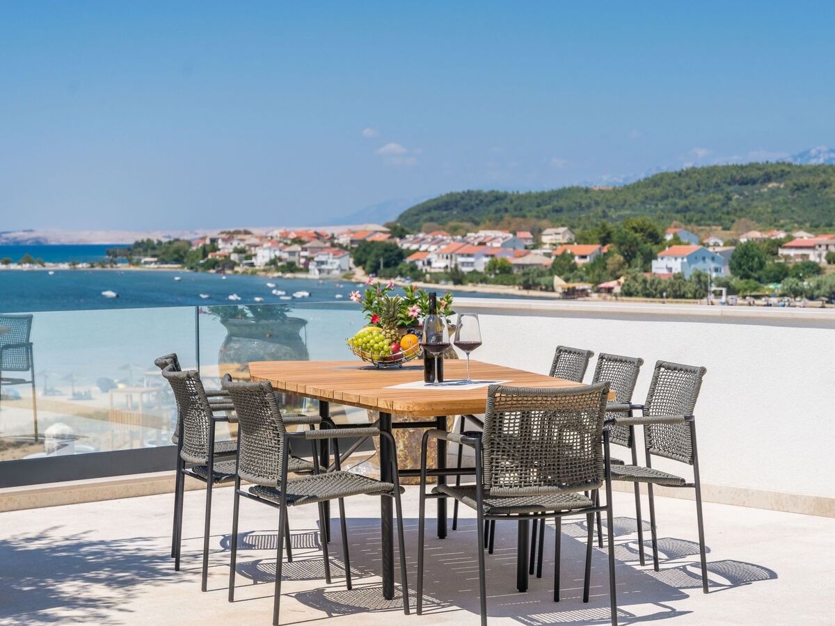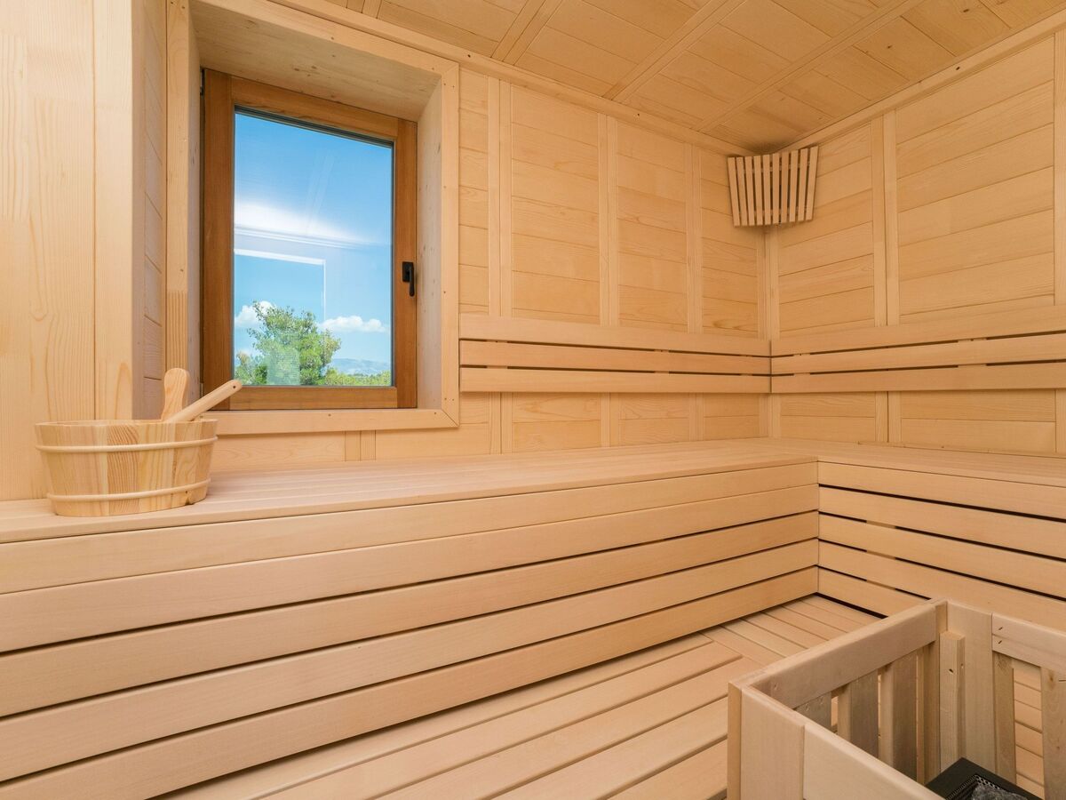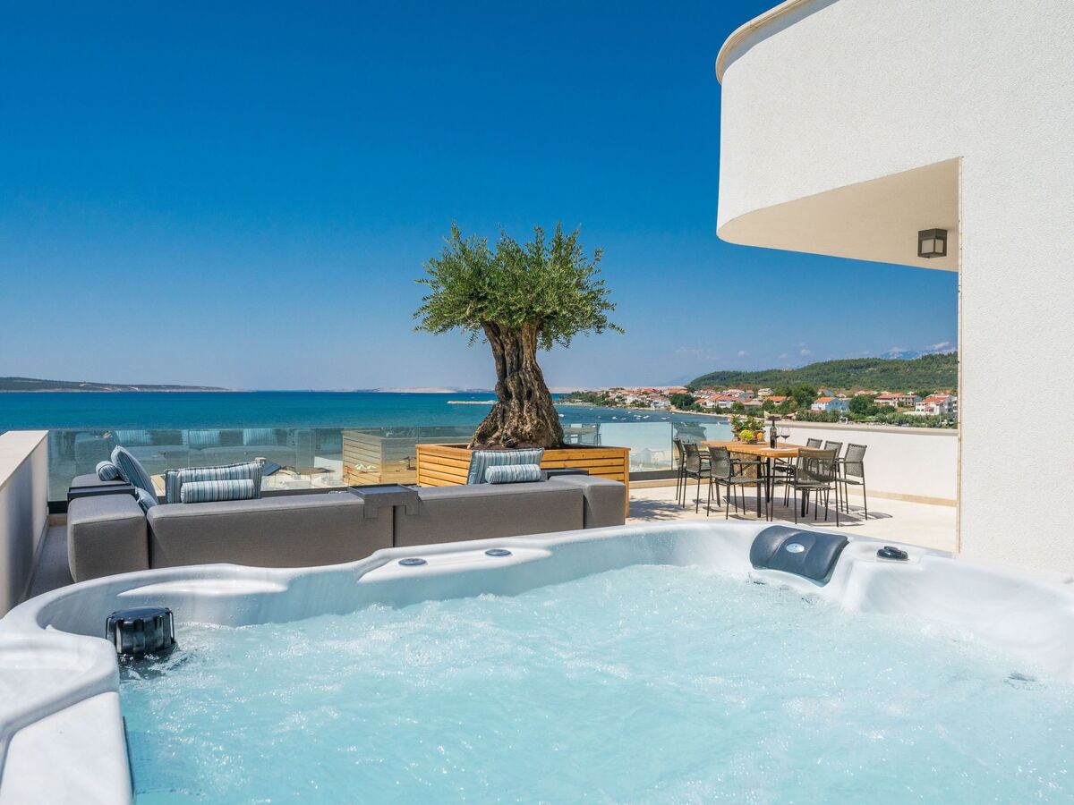On the first floor, on a 110 square metre roof terrace, there is a wellness area with a bath, sauna, whirlpool, outdoor shower and luxurious lounge furniture as well as an outdoor kitchen with a dining area for 10 people; from there (9 metres above the ground) you can enjoy a unique view of the Velebit Mountains and the sea.