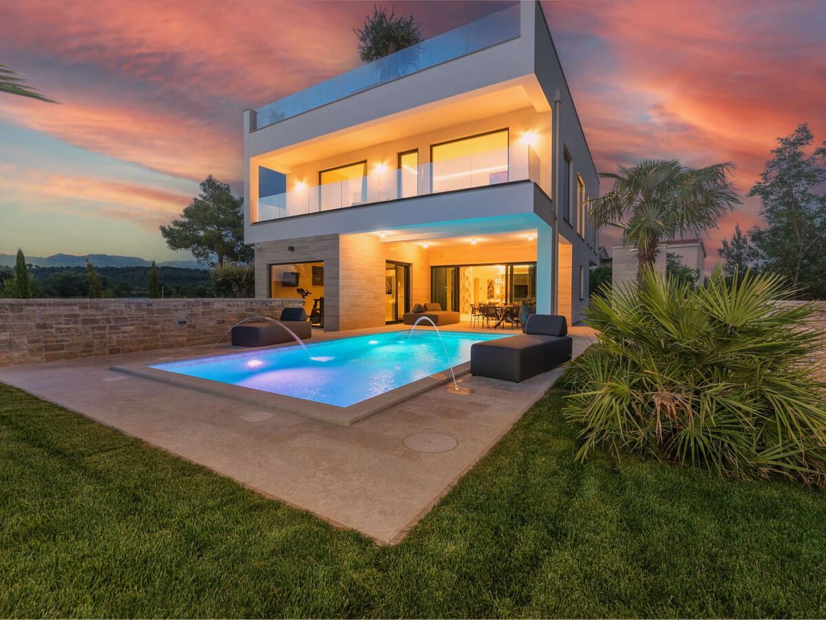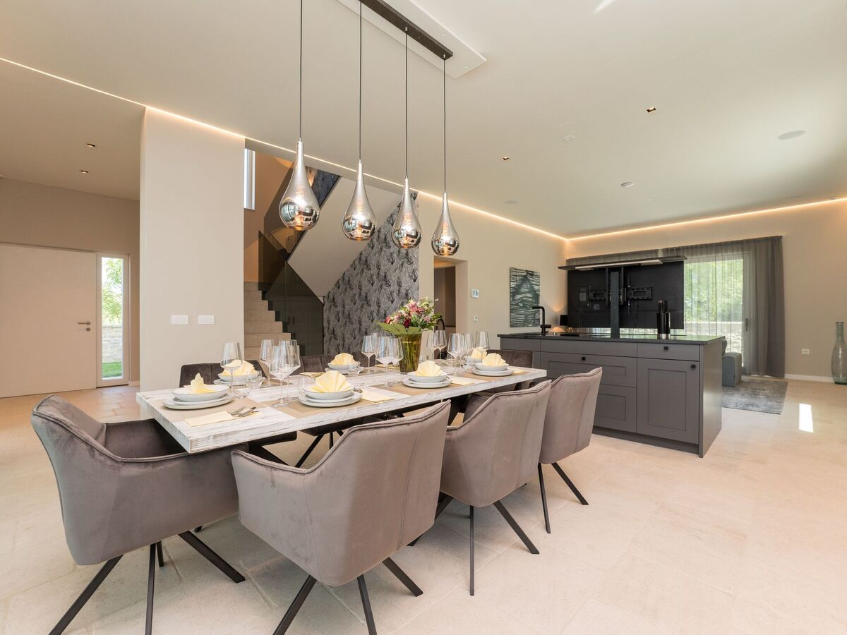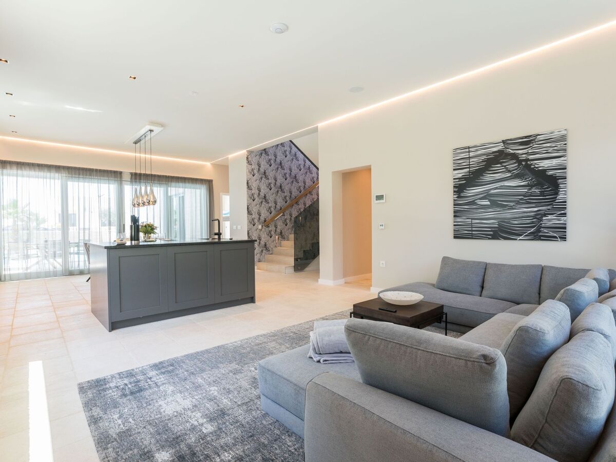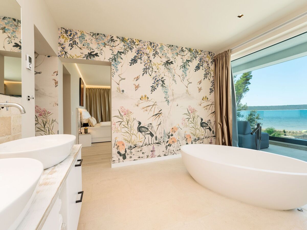 On the first floor, on a 110 square metre roof terrace, there is a wellness area with a bath, sauna, whirlpool, outdoor shower and luxurious lounge furniture as well as an outdoor kitchen with a dining area for 10 people; from there (9 metres above the ground) you can enjoy a unique view of the Velebit Mountains and the sea.