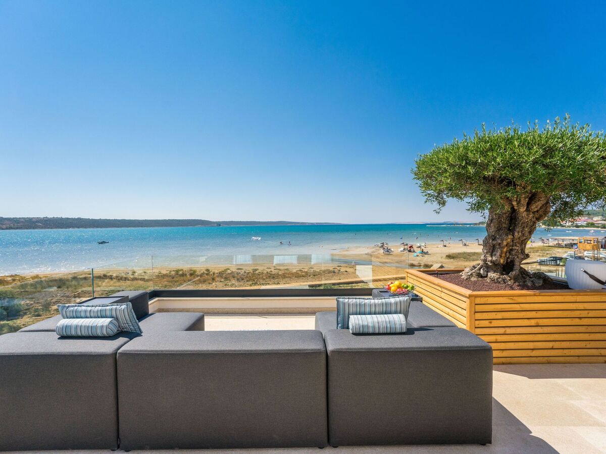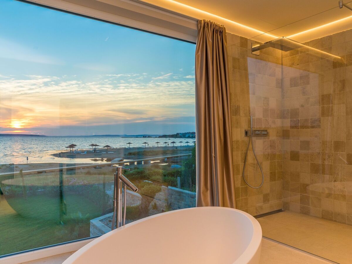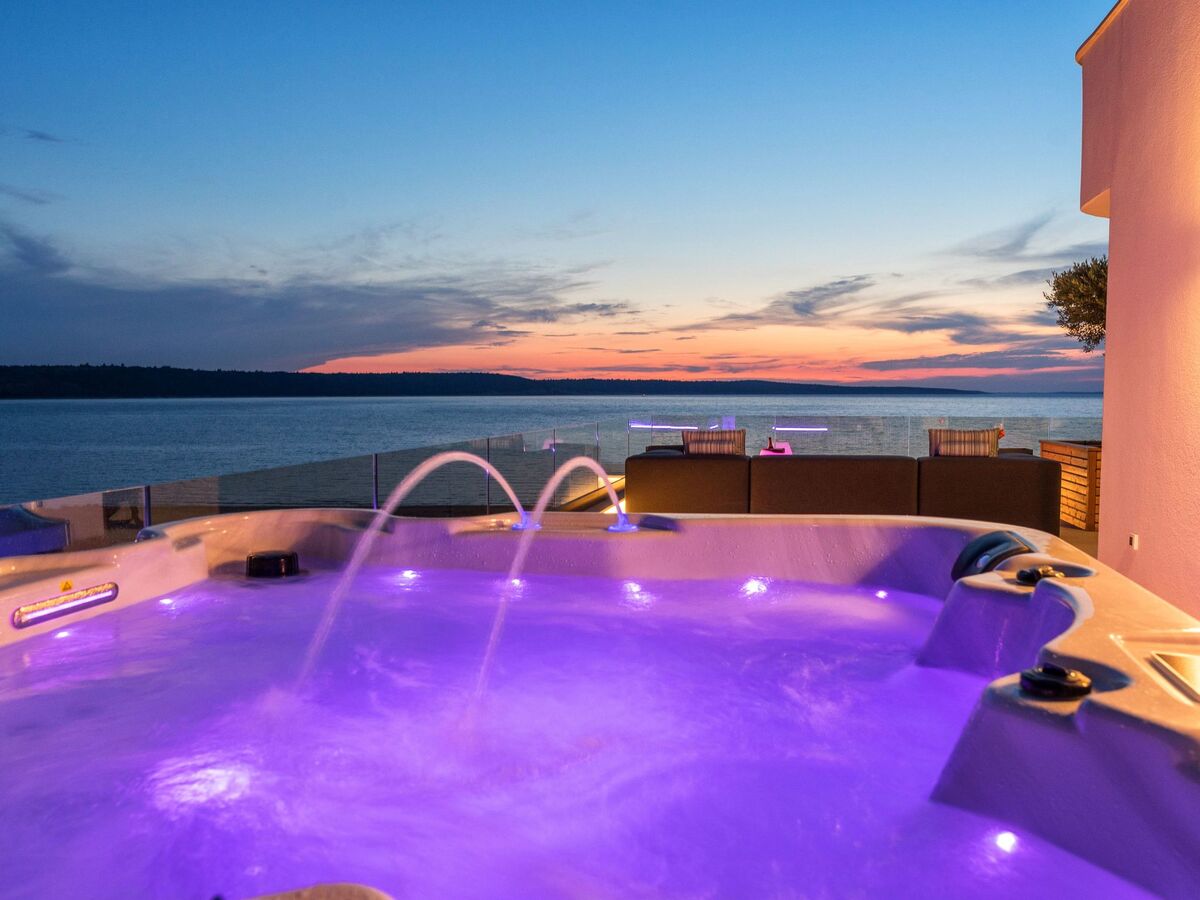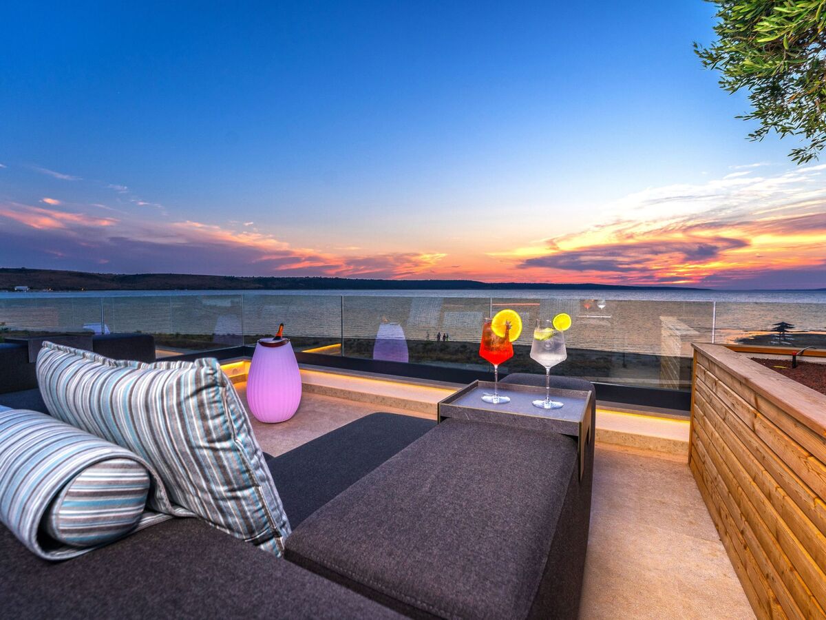 On the first floor, in addition to a wellness area with sauna, whirlpool, outdoor shower and luxurious lounge furniture, there is also an outdoor kitchen with a dining area for 10 people; from there (9 metres high) you have a unique view of the Velebit Mountains and the sea.