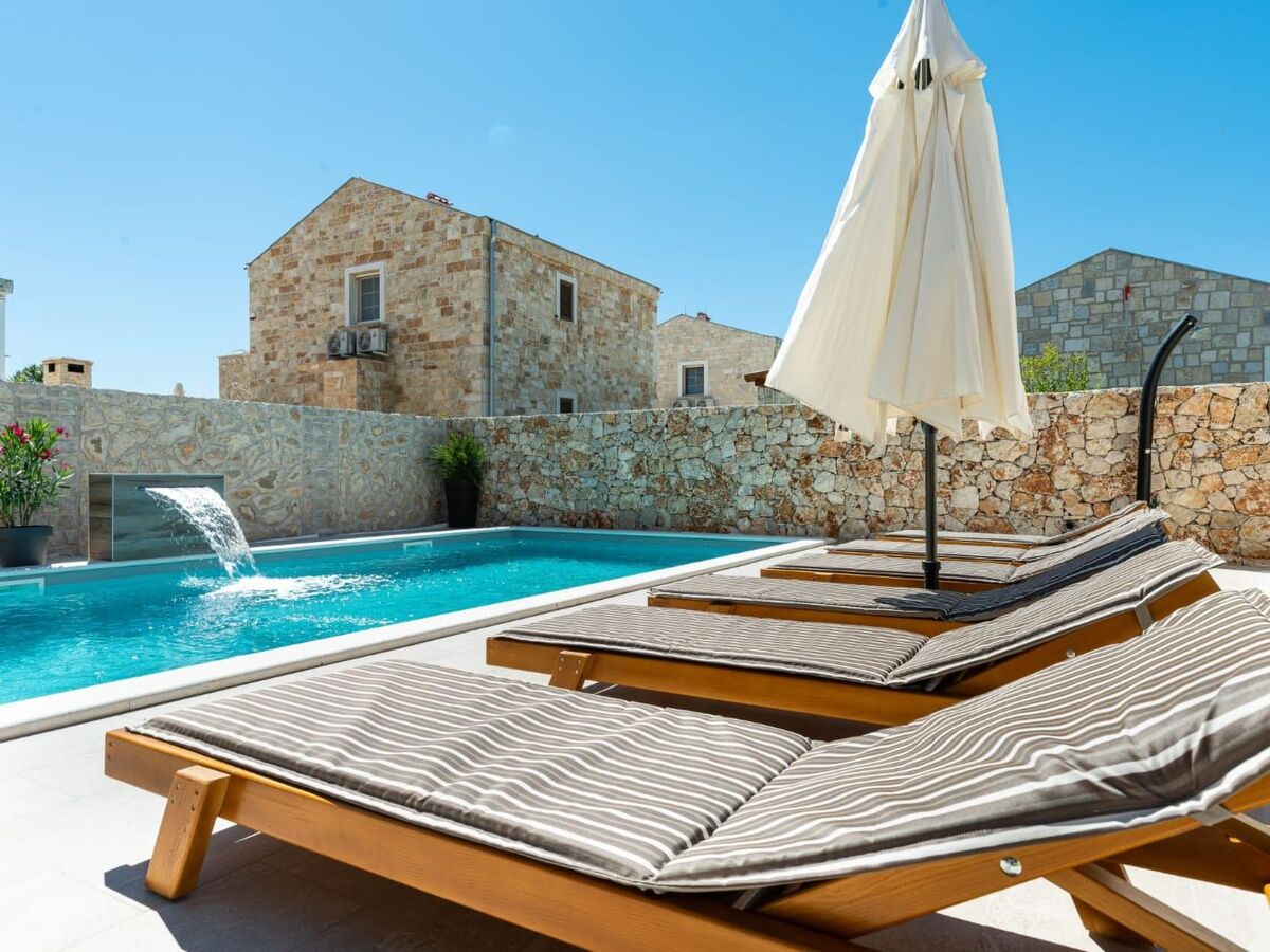 The villa has a private pool with deckchairs in the yard.