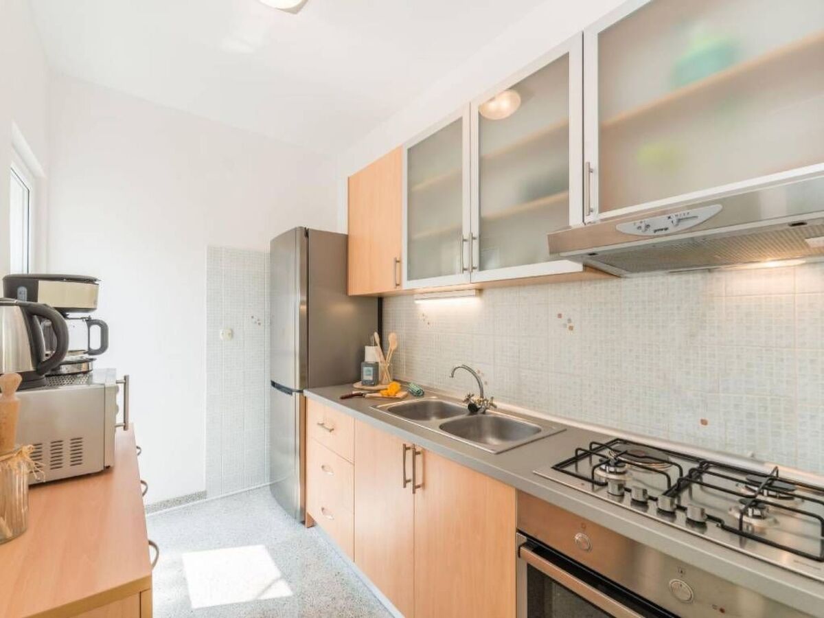 The living room is spacious and bright, and there is also a fully equipped kitchen.