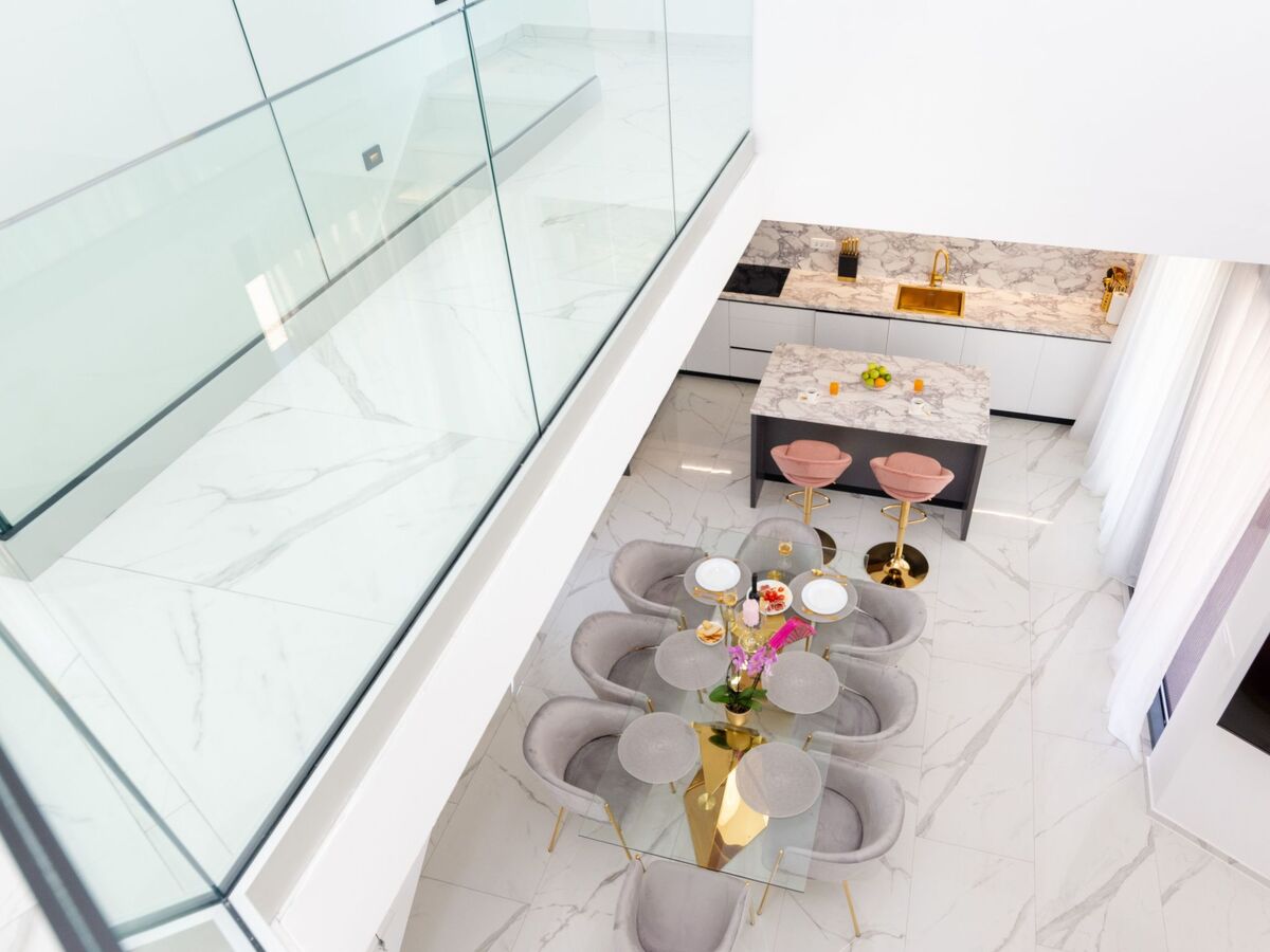 On the ground floor, the kitchen, dining room and living room have partial sea views.