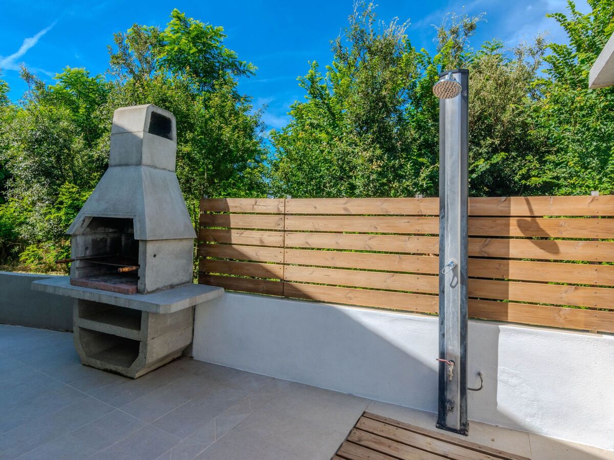 La cour intérieure (200 m²) dispose d'une piscine chauffée et d'un espace détente avec barbecue, douche extérieure, parasol et chaises longues.