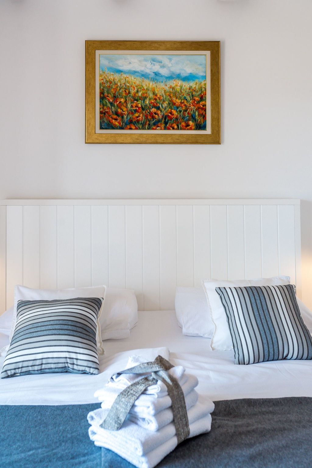 The villa has three modern bedrooms, two of which have double beds and one has two single beds.