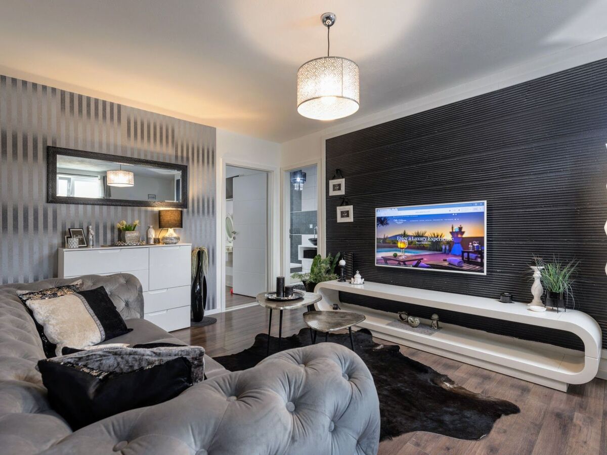 The holiday home features a fully equipped kitchen with adjoining dining area, a separate living area with terrace access, three bedrooms and three bathrooms with rain showers.