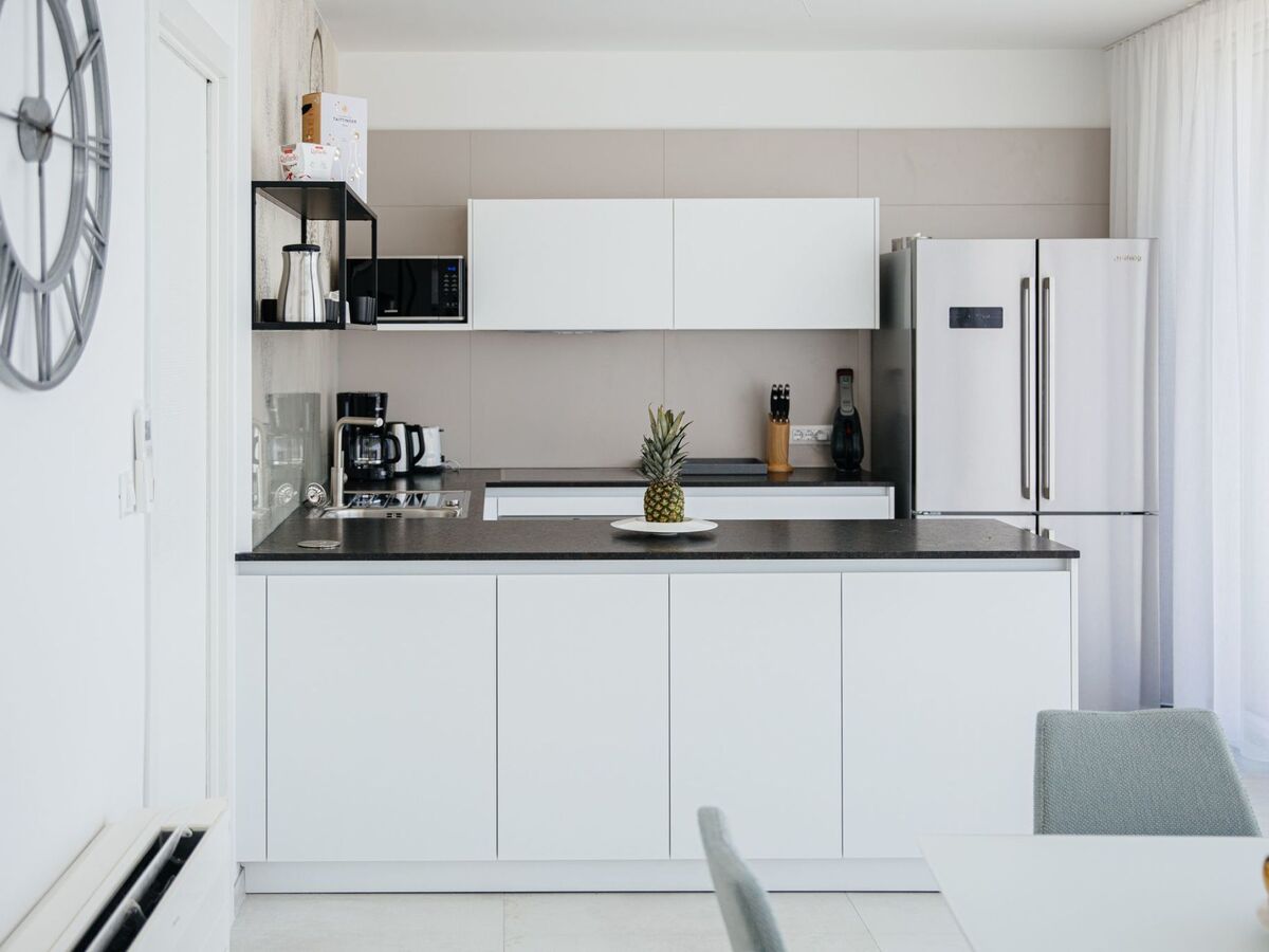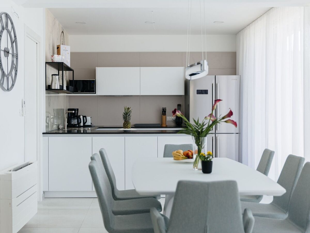 On the ground floor a wide and open space with a cosy living room corner, spacious dining area and a fully equipped kitchen.