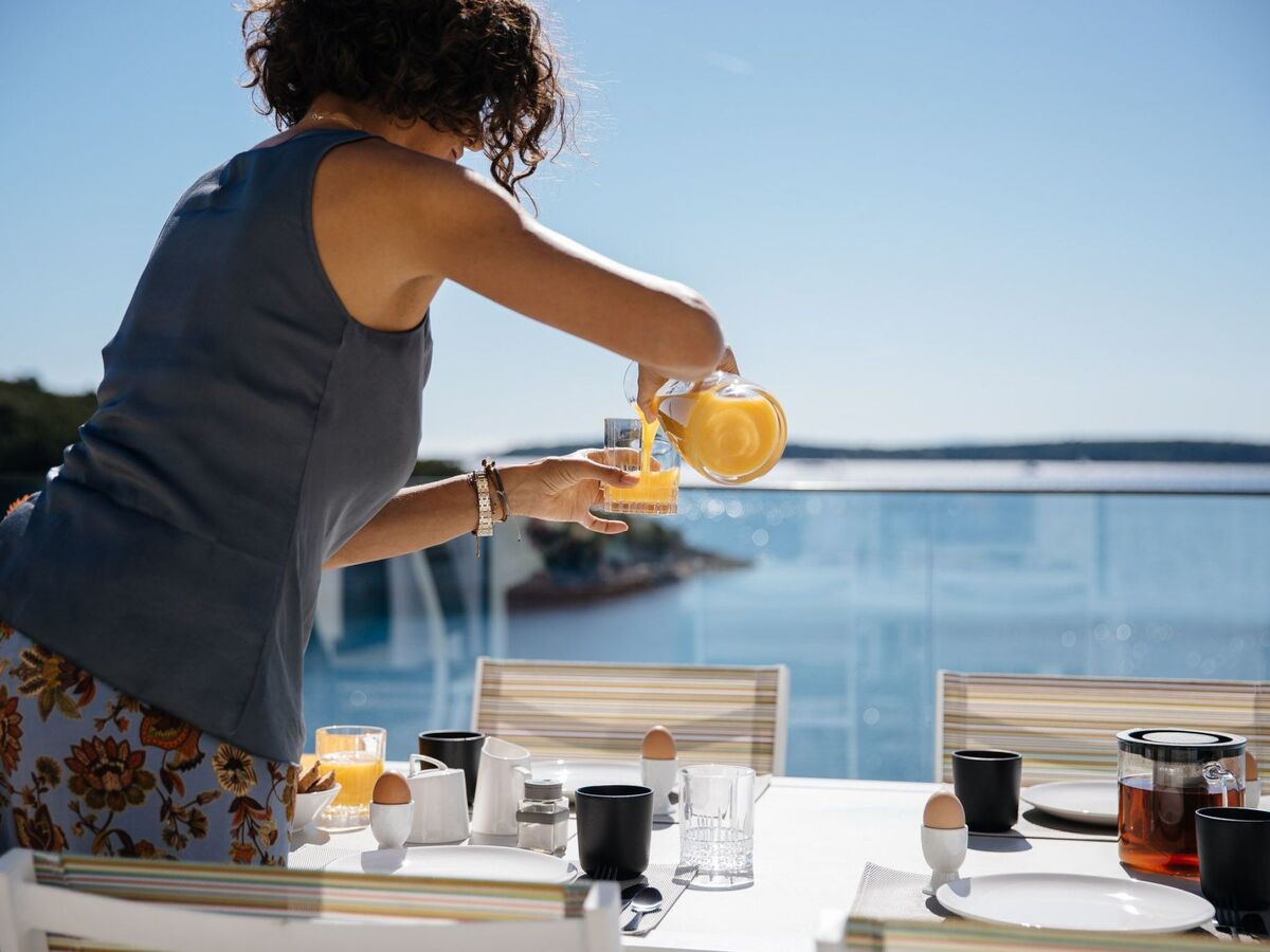 An outdoor shower by the pool and a built-in barbecue with equipment mean you can sit happily in the shady corner of the terrace and enjoy the fantastic view in the evening.