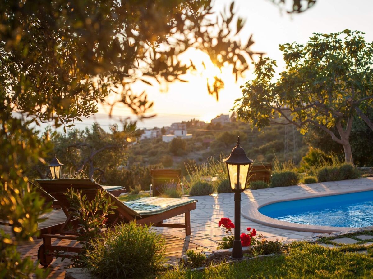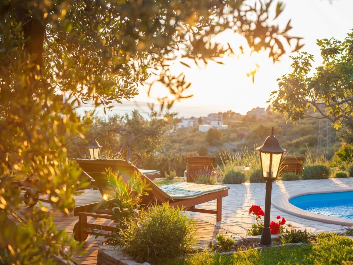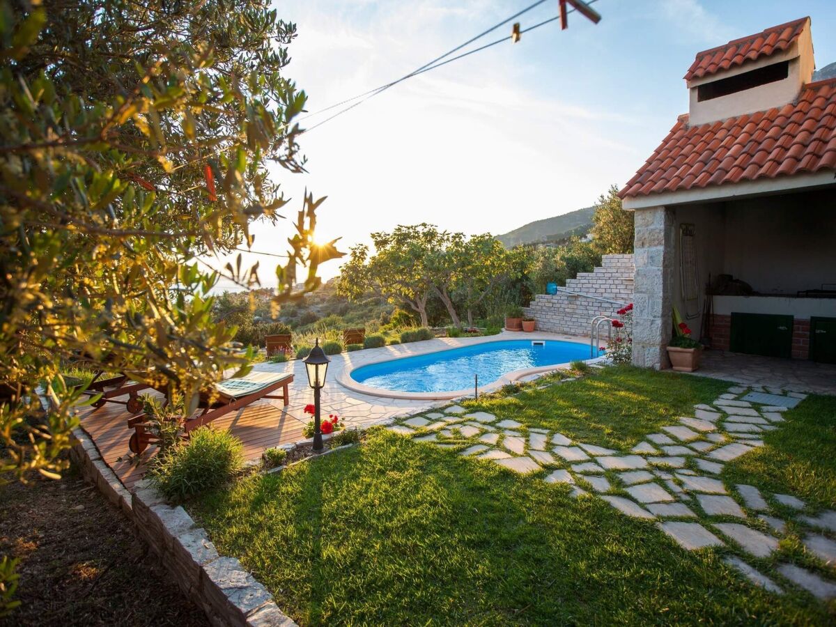 The rustic villa has a beautiful garden with swimming pool and sun loungers.