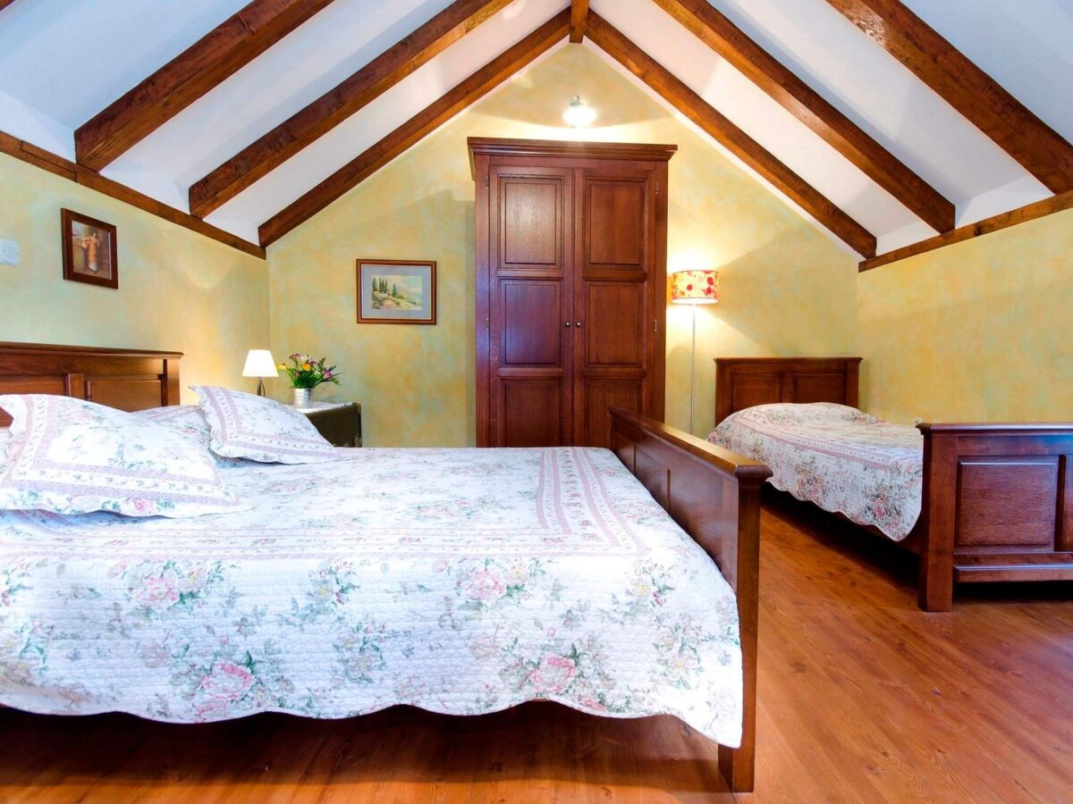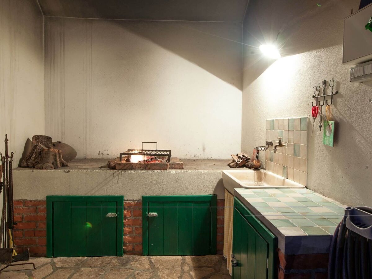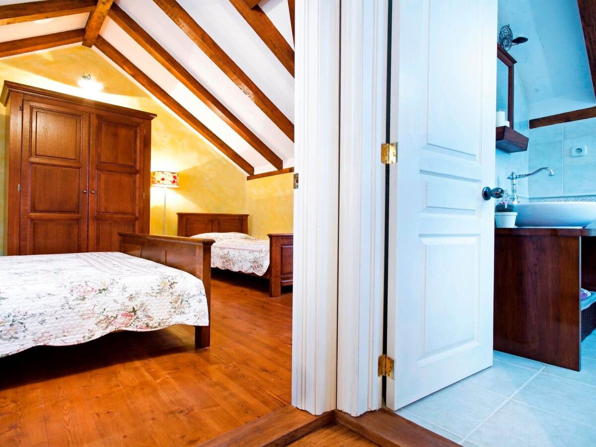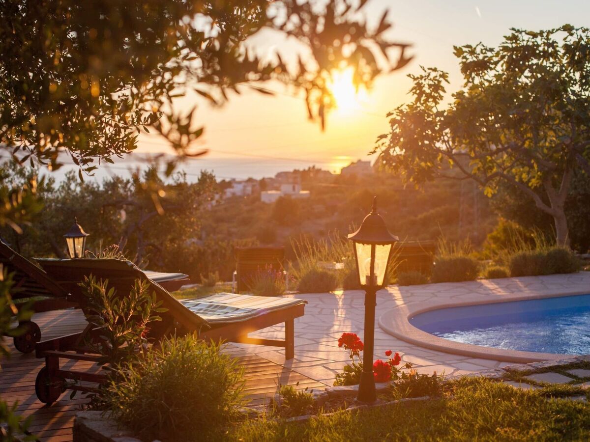 The rustic villa has a beautiful garden with swimming pool and sun loungers.