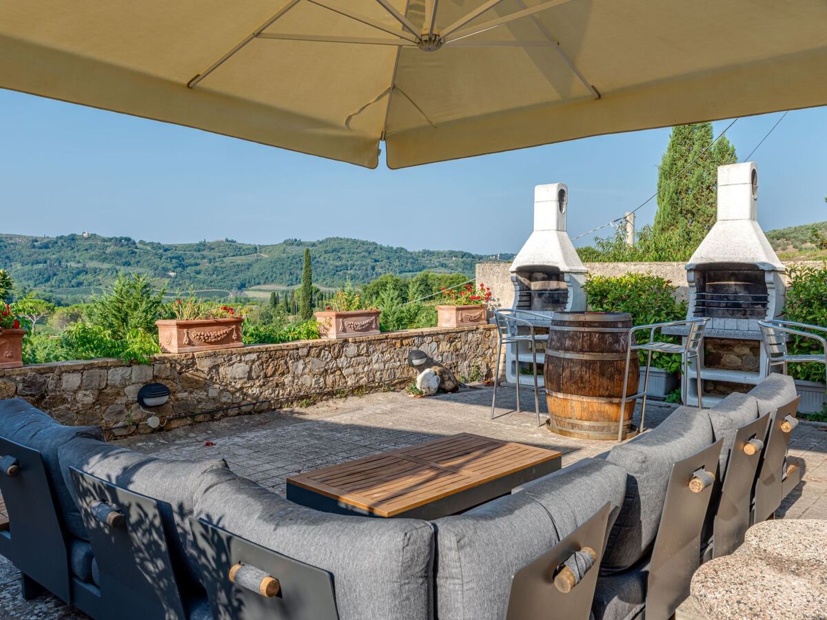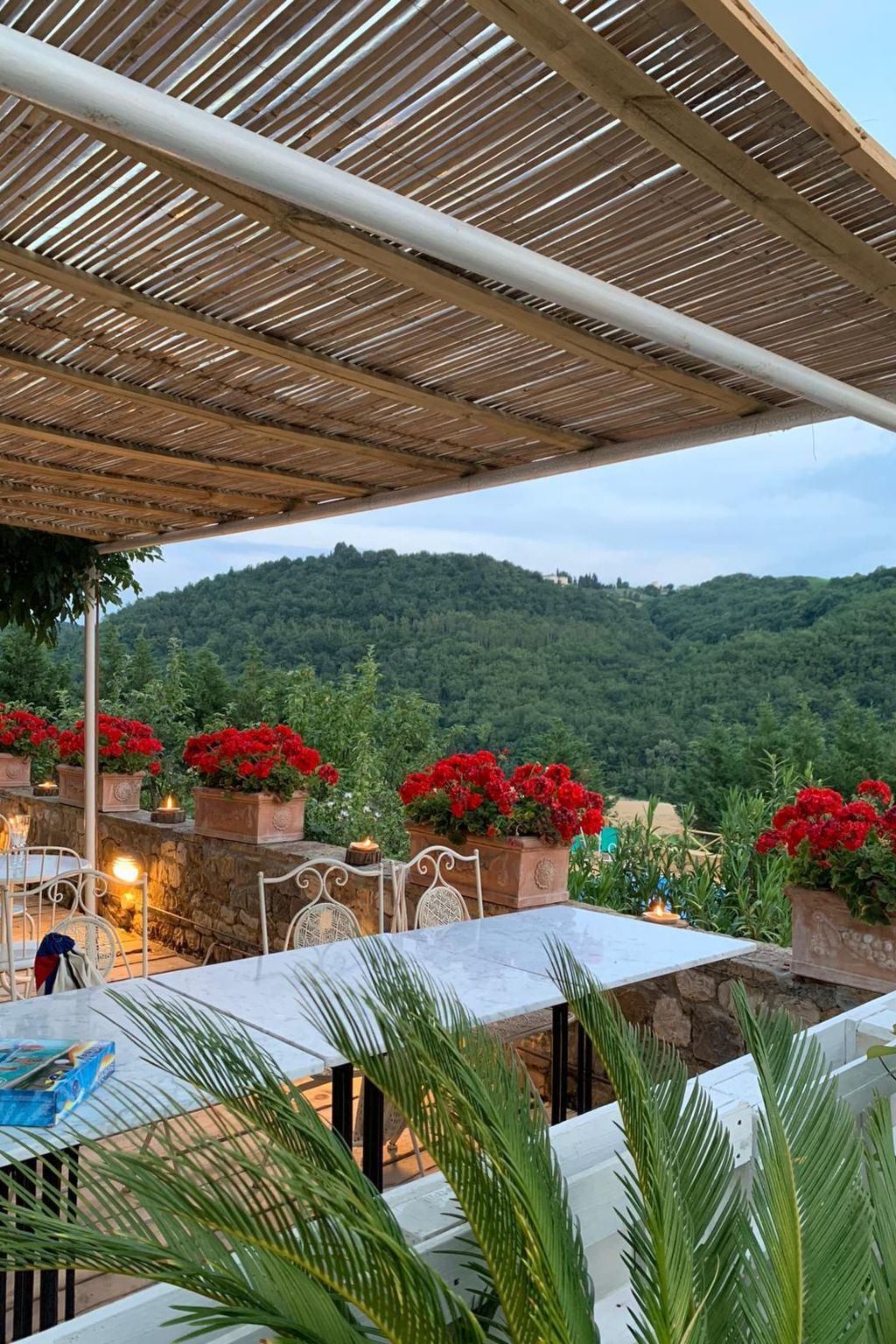 Surplombant les vignobles du Chianti, la terrasse est parfaite pour les déjeuners, les dîners ou les événements privés, et peut accueillir jusqu'à 70 personnes.