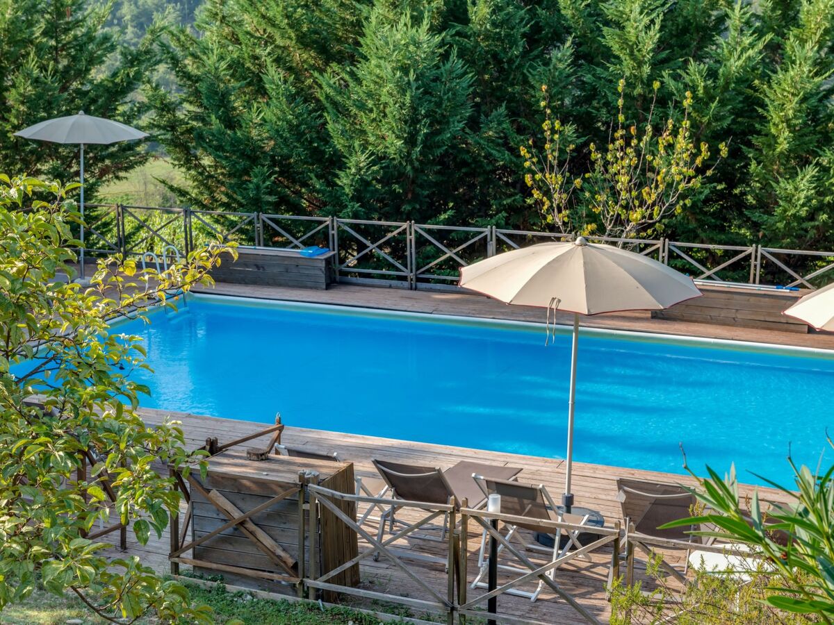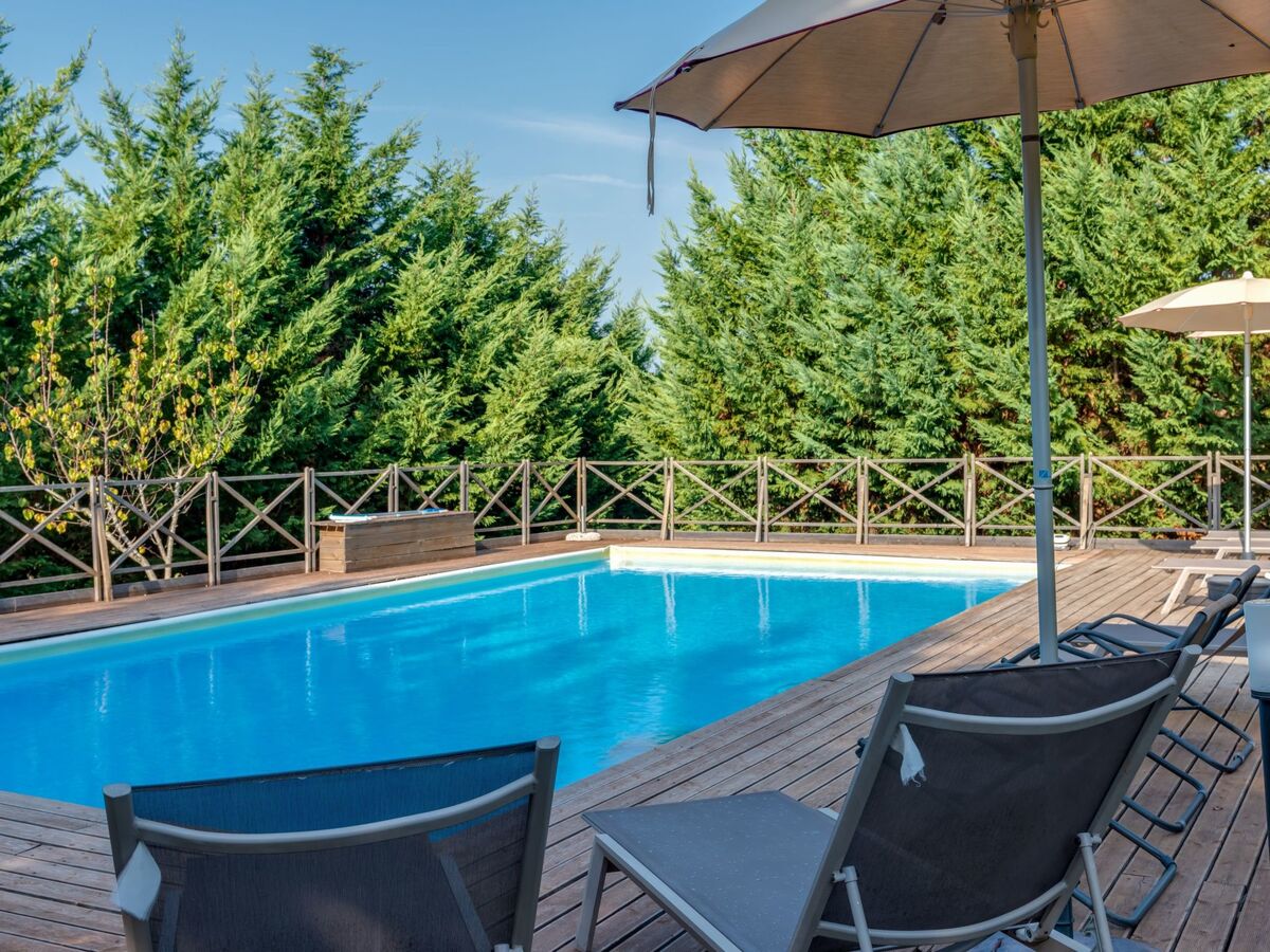 La grande piscine à l'extérieur en bois donne sur les vignobles et comprend un solarium spécial en bois pour profiter des journées d'été dans la plus grande intimité.