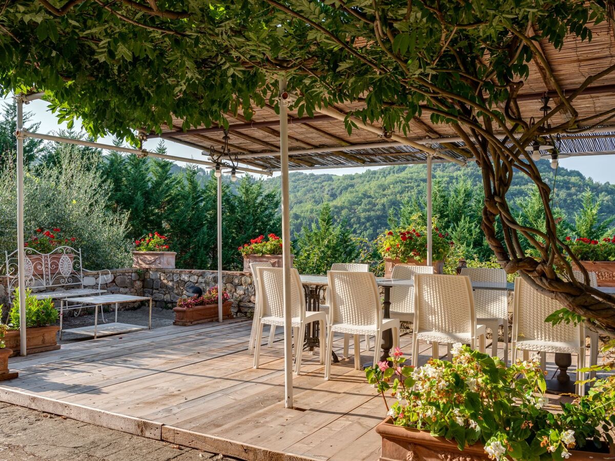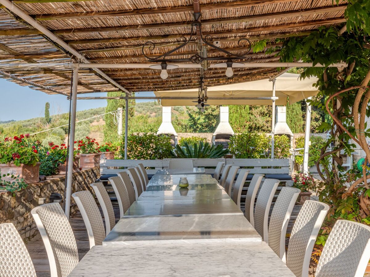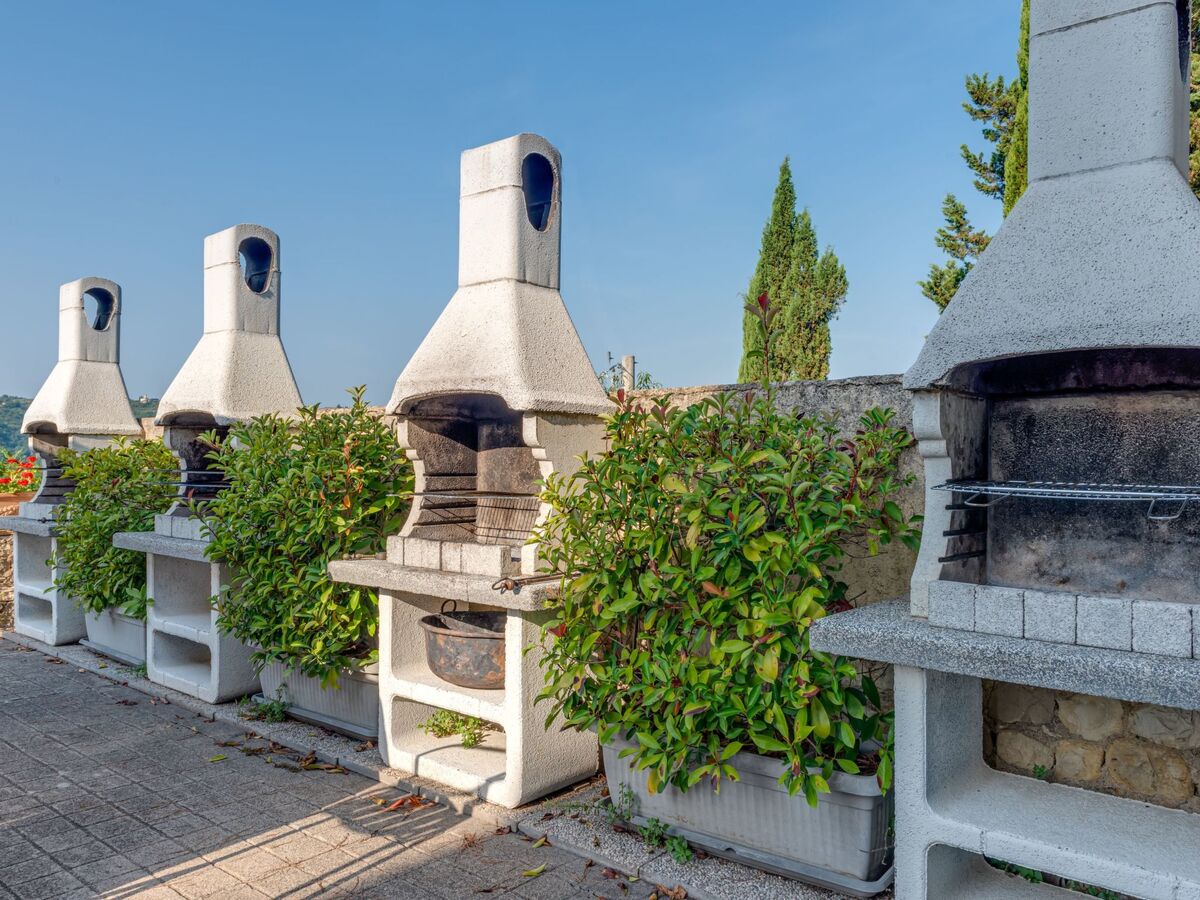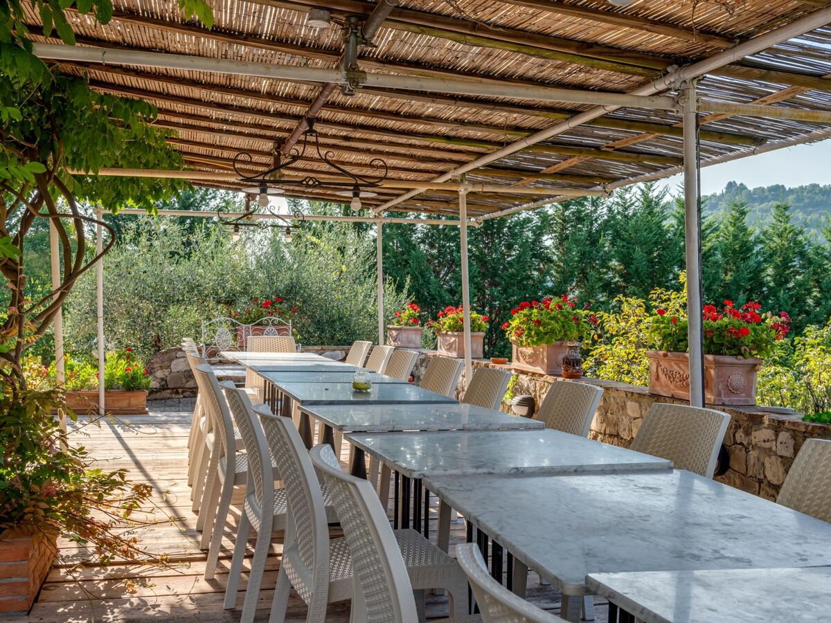 Dans le jardin, vous trouverez également une magnifique terrasse en pierre à l'ombre d'une belle pergola de glycine et, à une courte distance, un espace barbecue avec quatre stations pour vos barbecues pendant les fraîches soirées d'été.