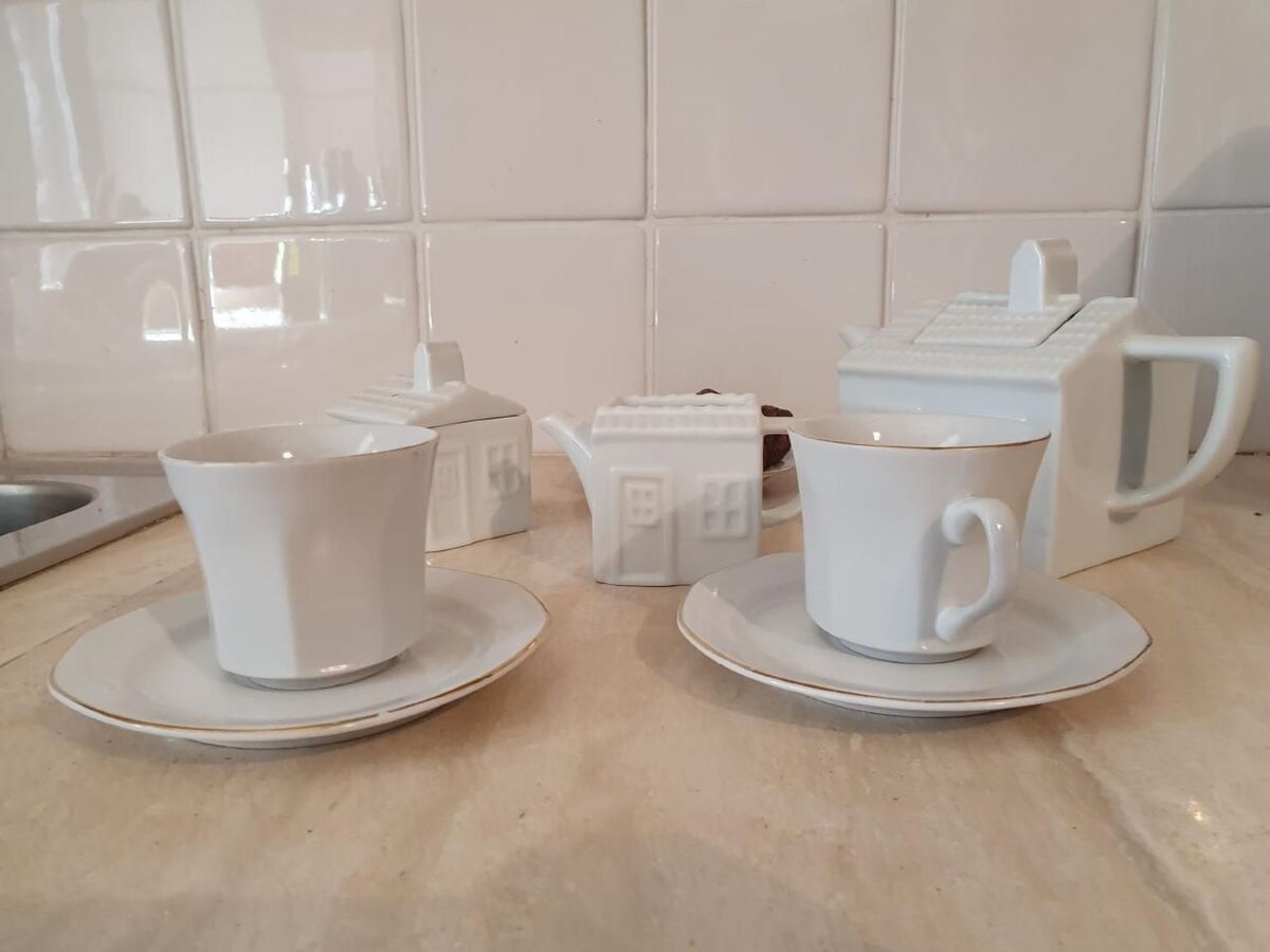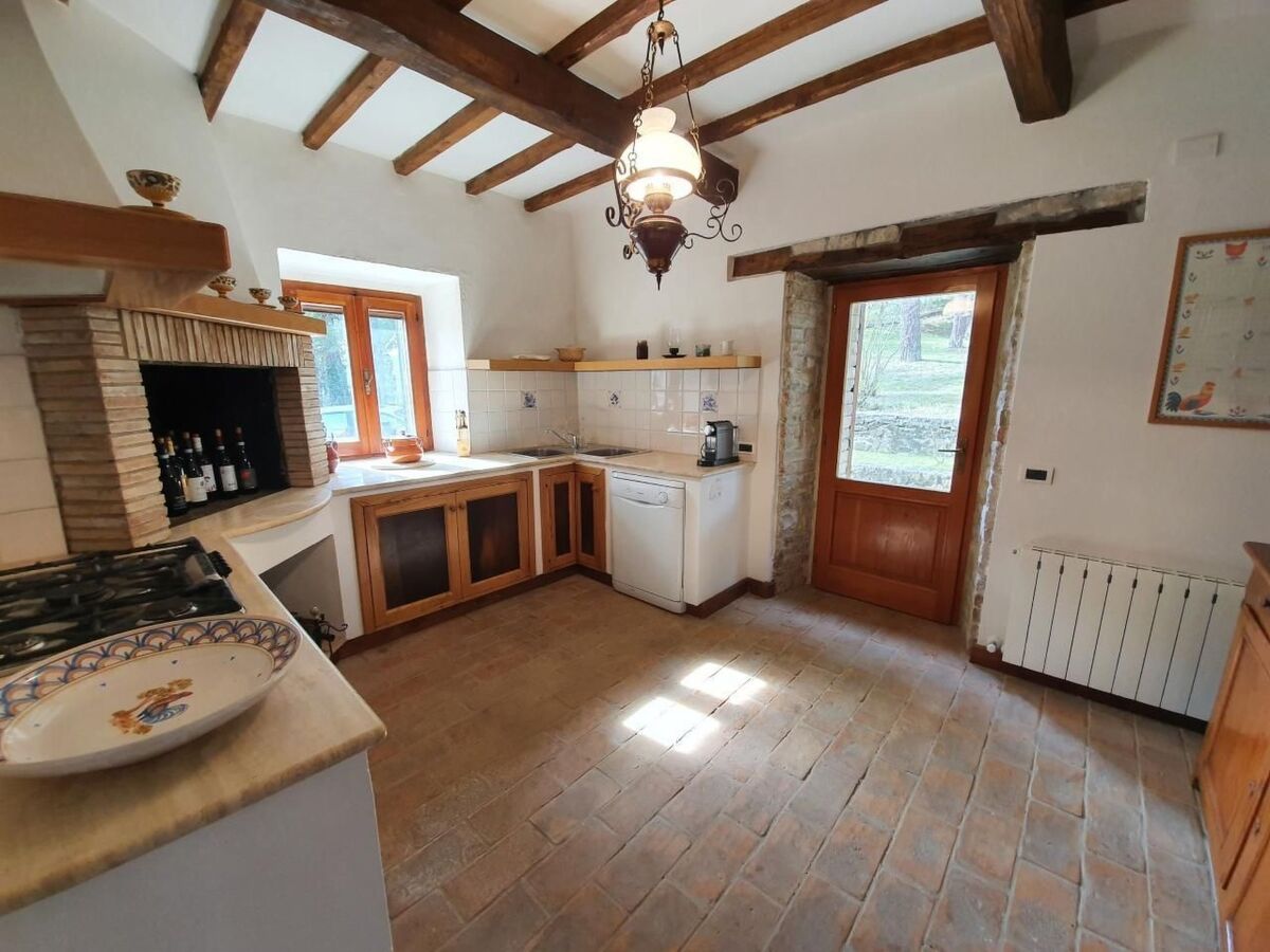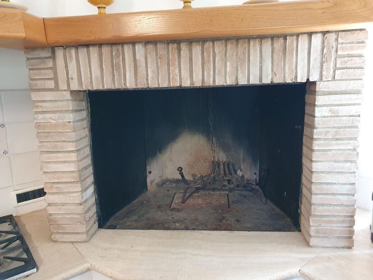The large, fully equipped kitchen includes a dishwasher and a cosy fireplace, perfect for intimate evenings.