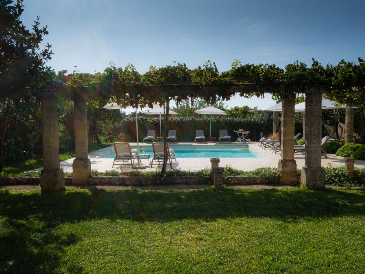 The swimming pool (measuring 7 m x 7 m, depth 140 cm - hydro-massage jet on one side) is almost set in the space delimited by the colonnade and has a paved area with modern parasols and sun loungers.