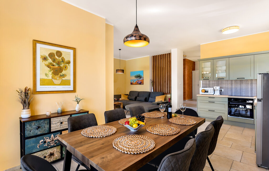 Cette maison vous accueille dans une atmosphère chaleureuse et harmonieuse, dans laquelle des tons doux de jaune et de terre, des meubles élégants et une cuisine moderne et bien équipée créent un sentiment de confort. Profitez de moments de détente autour de la grande table à manger, cuisinez ensemble et prenez le temps de prendre de longs repas en toute convivialité. Installez-vous ensuite confortablement dans le salon, lisez un livre ou écoutez de la musique.