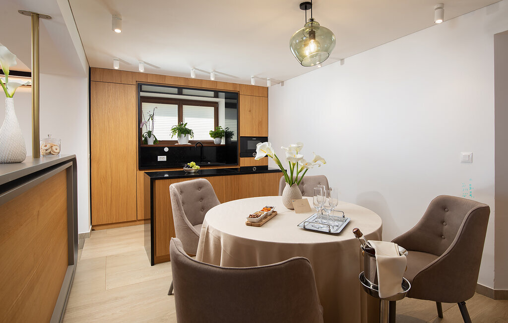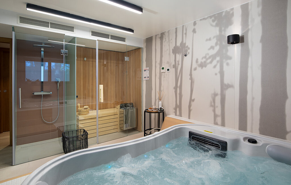 Entrez et profitez de la combinaison élégante de meubles modernes et d'éléments en bois chaleureux. Détendez-vous dans le salon ouvert avec un canapé confortable et une télévision, tandis que les grandes fenêtres offrent une vue sur la mer. Profitez de l'accès direct à la terrasse pour relier l'intérieur et l'extérieur. Préparez vos repas dans la cuisine équipée de haute qualité et prenez place autour de la table élégamment décorée. Après une journée bien remplie, laissez-vous aller dans le jacuzzi ou retirez-vous dans le sauna pour un repos bienfaisant.