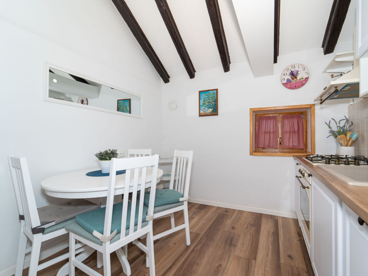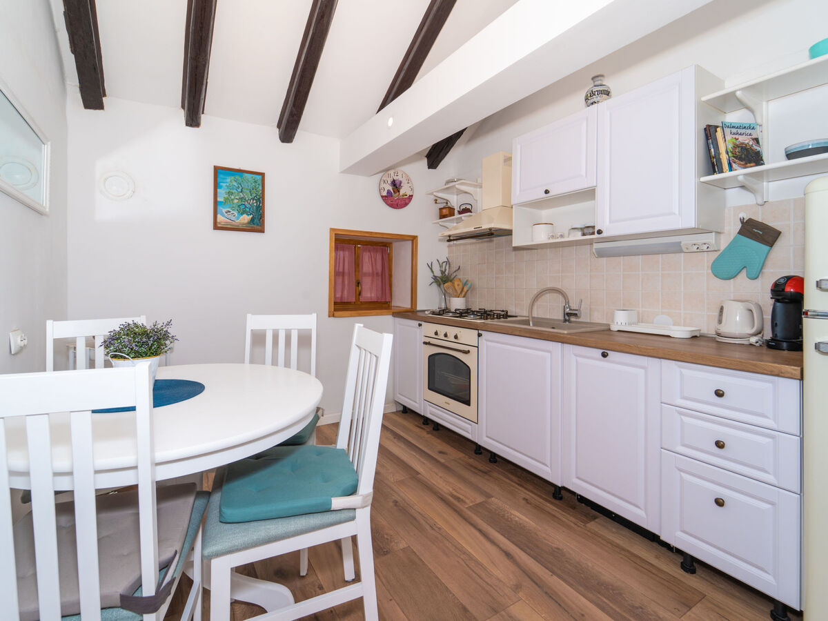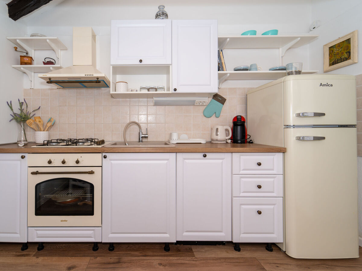 Cuisine ouverte (4 plaques de cuisson, four, lave-vaisselle, grille-pain, bouilloire électrique, micro-ondes, congélateur, cafetière électrique) avec table pour les repas.