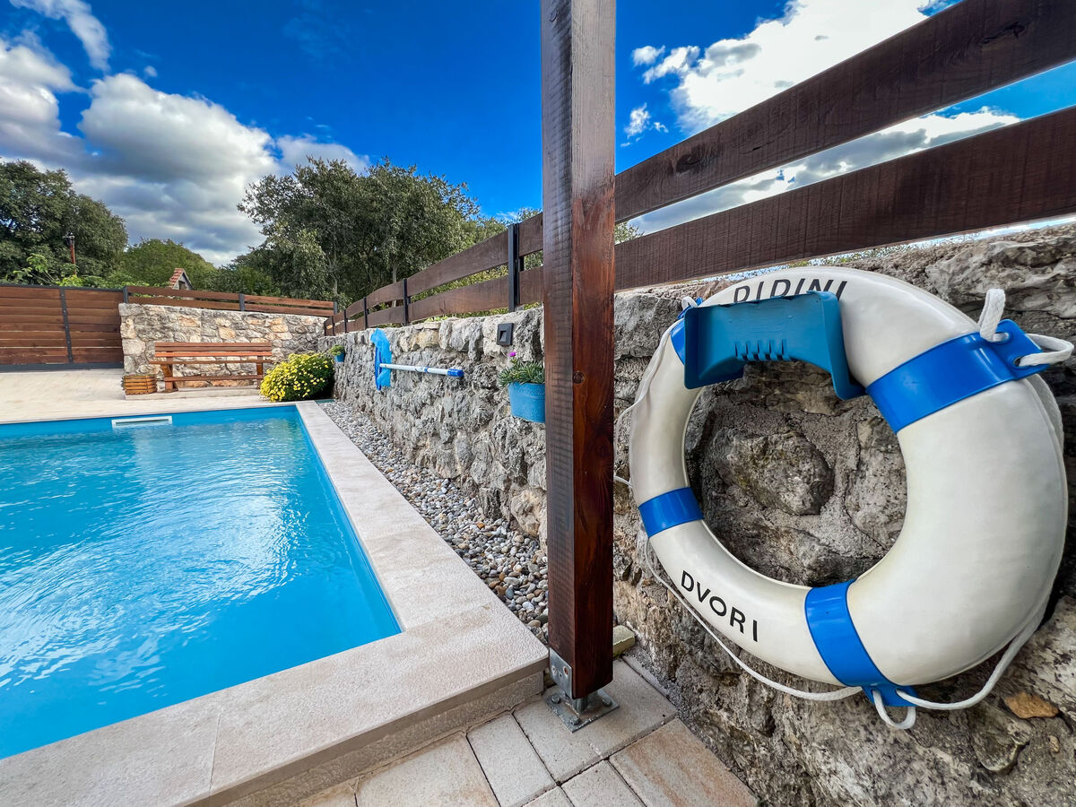 A usage privé: terrain 380 m2 (clôturé), jardin 40 m2, piscine rectangulaire (6 x 3 m, 18 m2, profondeur 100 - 140 cm, disponibilité saisonnière: 01.Avr.