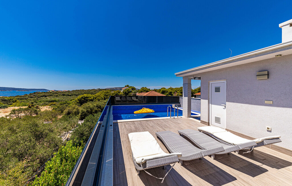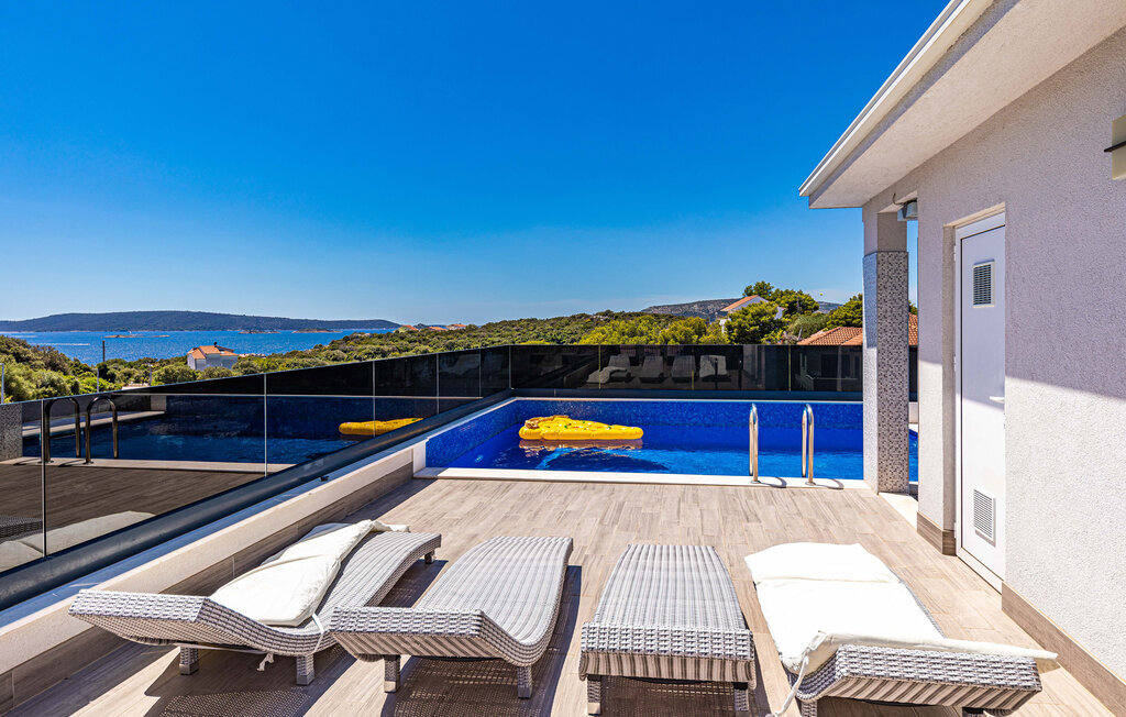 Profitez d'une pause ensoleillée dans cette maison de vacances confortable avec piscine et vue sur la mer.