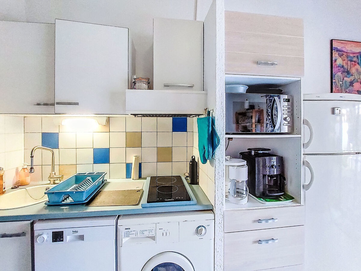 Coin cuisine (2 plaques de cuisson, lave-vaisselle, cafetière électrique, combiné micro-ondes).