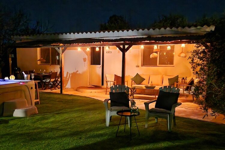 Rez-de-chaussée: (cuisine ouverte(bouilloire, grille-pain, cafetière/percolateur(cups), micro ondes, lave-vaisselle , réfrigérateur, Presse-agrumes, Mixeur), salle à manger-salon(TV(smart TV), table, coin salon), chambre(lit double, Lit superposé, climatisation), salle de bains(douche(douche à l'italienne), lavabo, WC, sèche-cheveux)) Bain à bulles, terrasse(privé, couverte), terrasse, jardin, mobilier de jardin, barbecue, salon de jardin