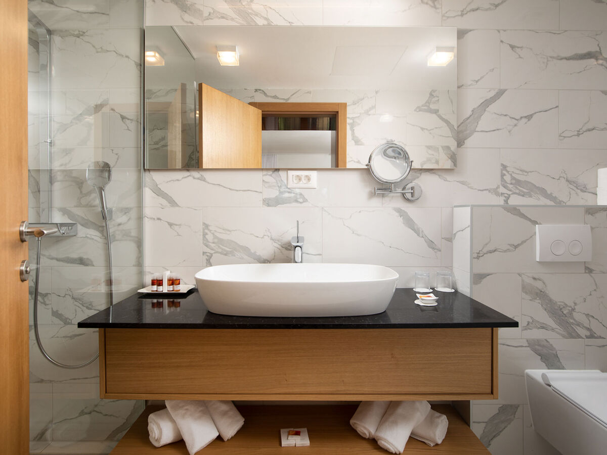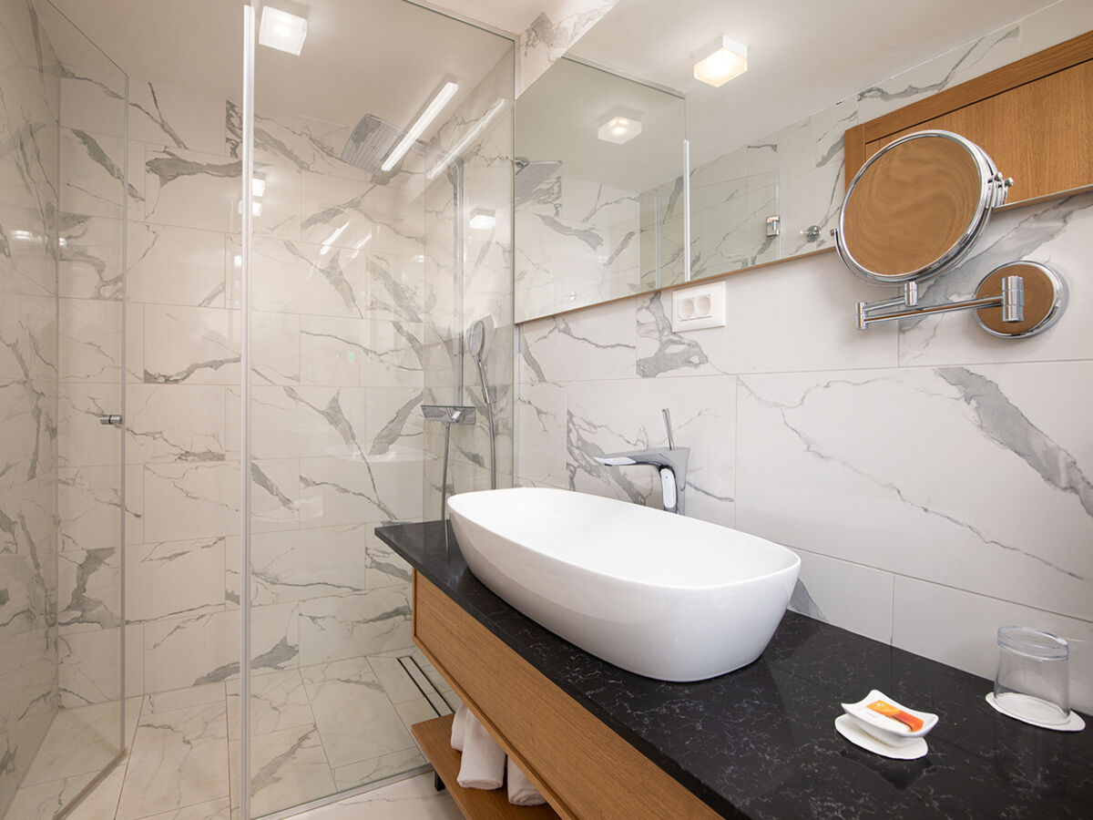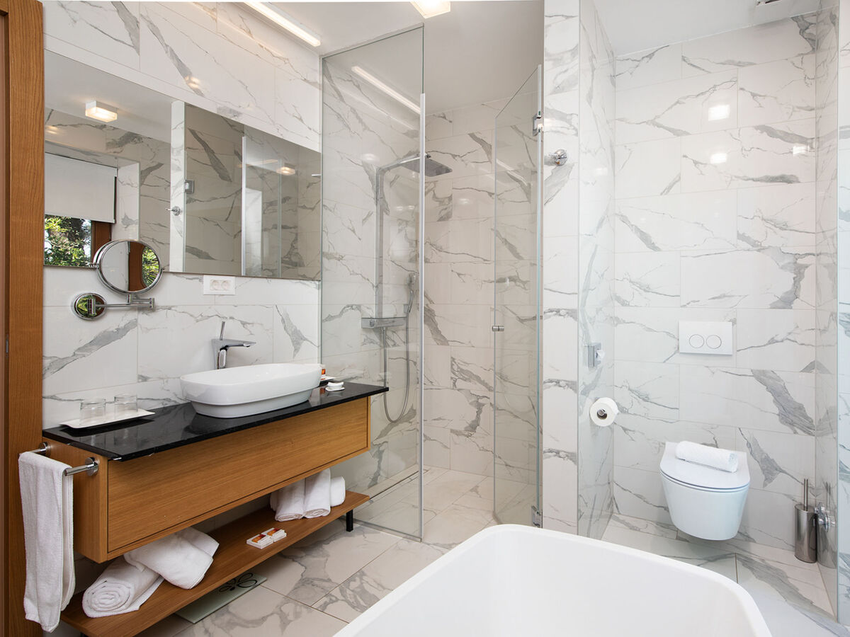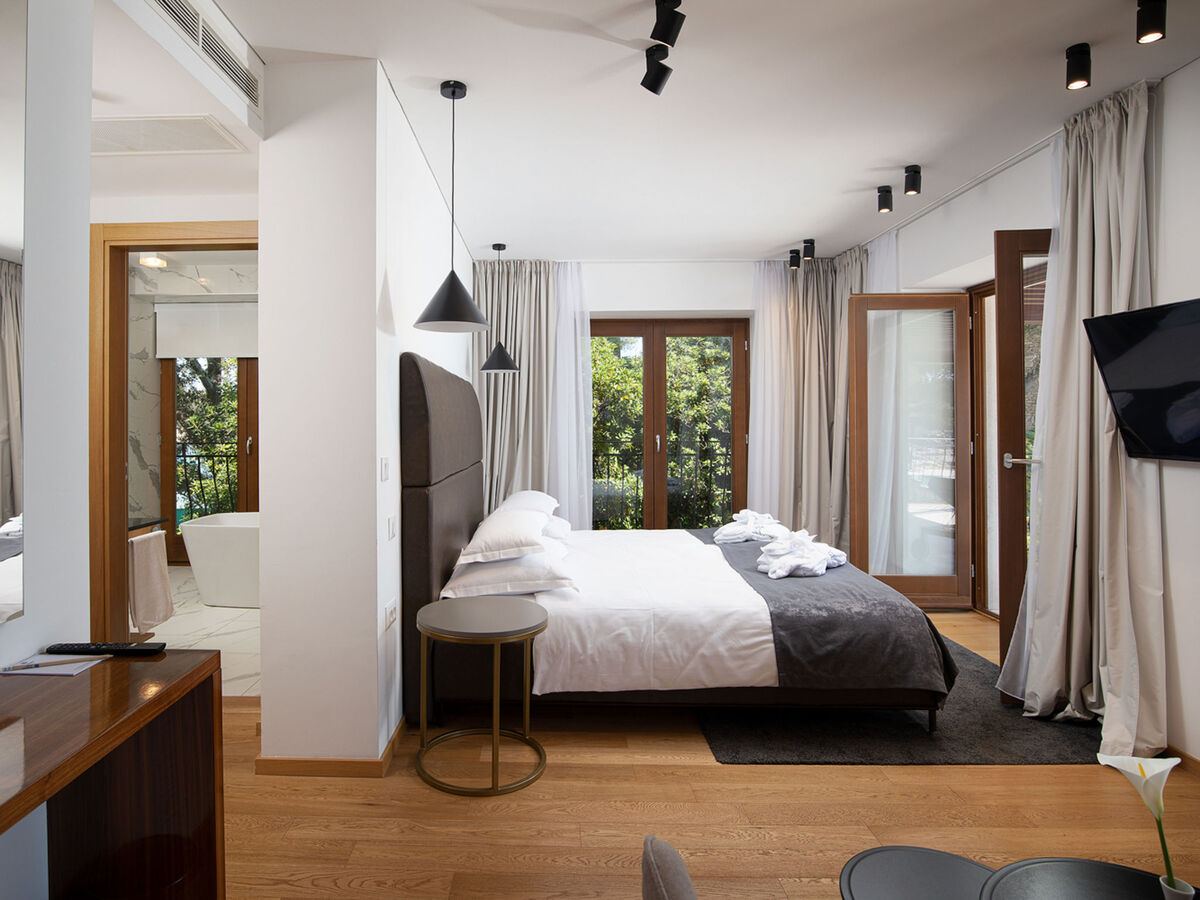 1 chambre avec 1 grand-lit (200 cm, longueur 200 cm), douche/WC, bain/douche et TV (satellite) (écran plat), air-conditionné.