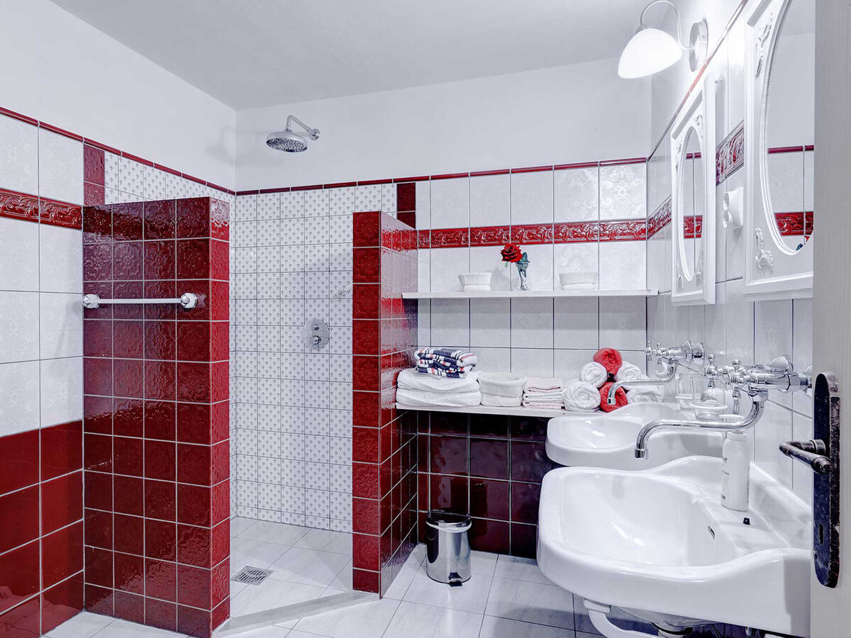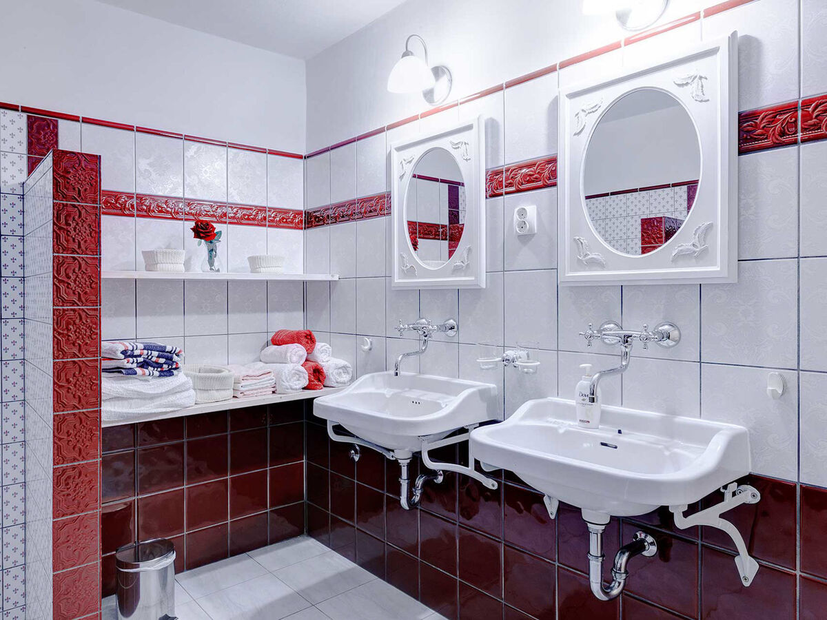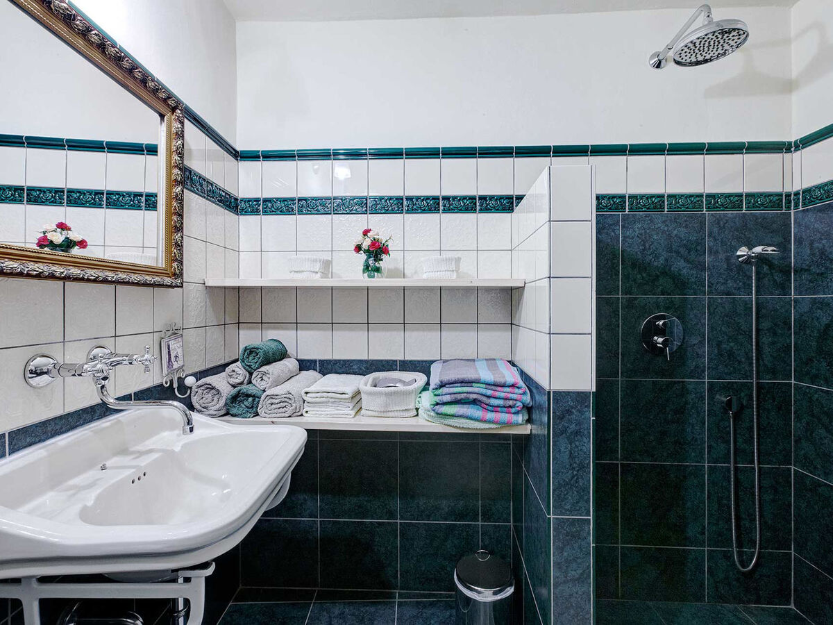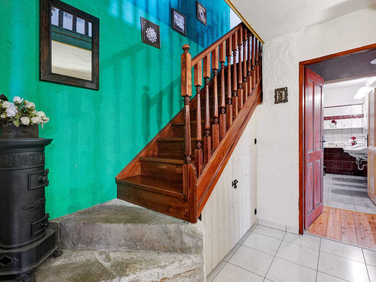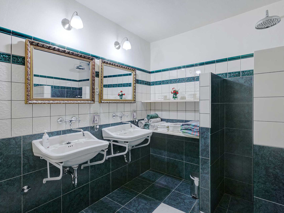 À l'étage inférieur: 2 chambres, chaque chambre avec: 1 lit (90 cm, longueur 200 cm), 1 grand-lit (180 cm, longueur 200 cm), douche/WC.