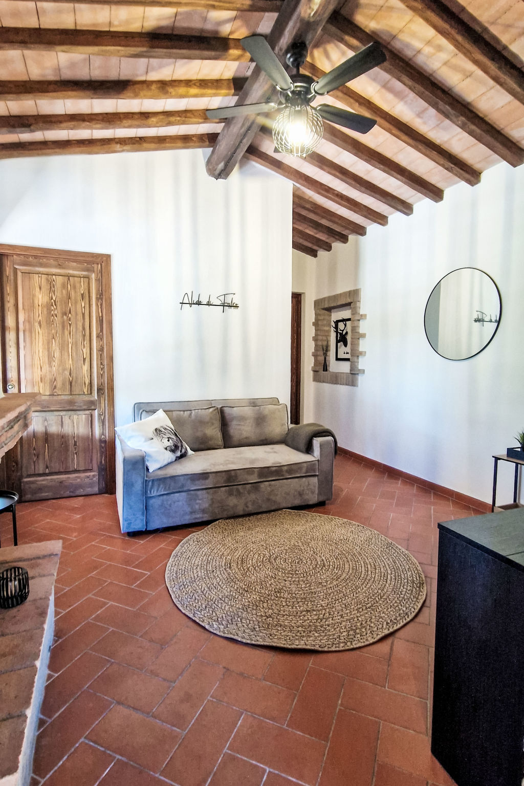Aménagement agréable et moderne: séjour/salle à manger avec cheminée (uniquement à titre de décoration), table pour les repas et TV (écran plat), chauffage électrique et ventilateur.