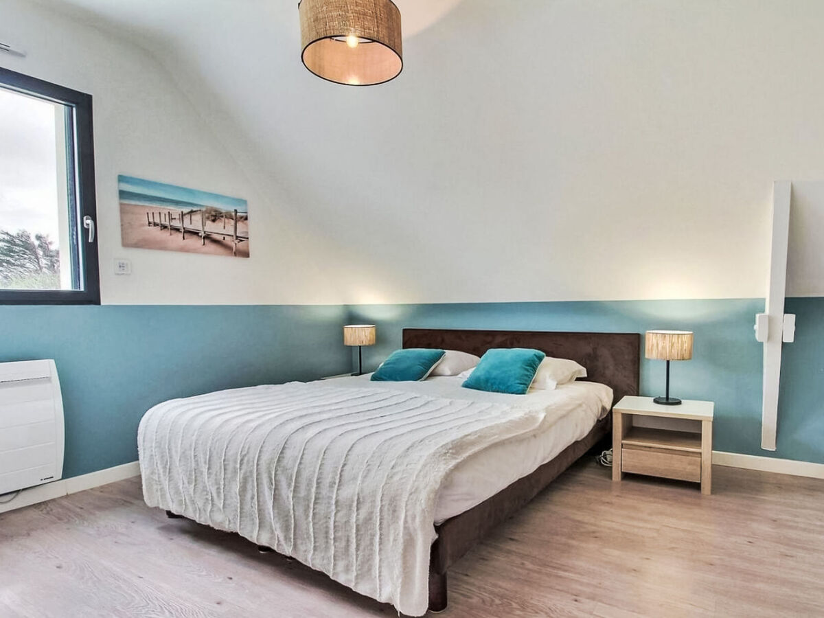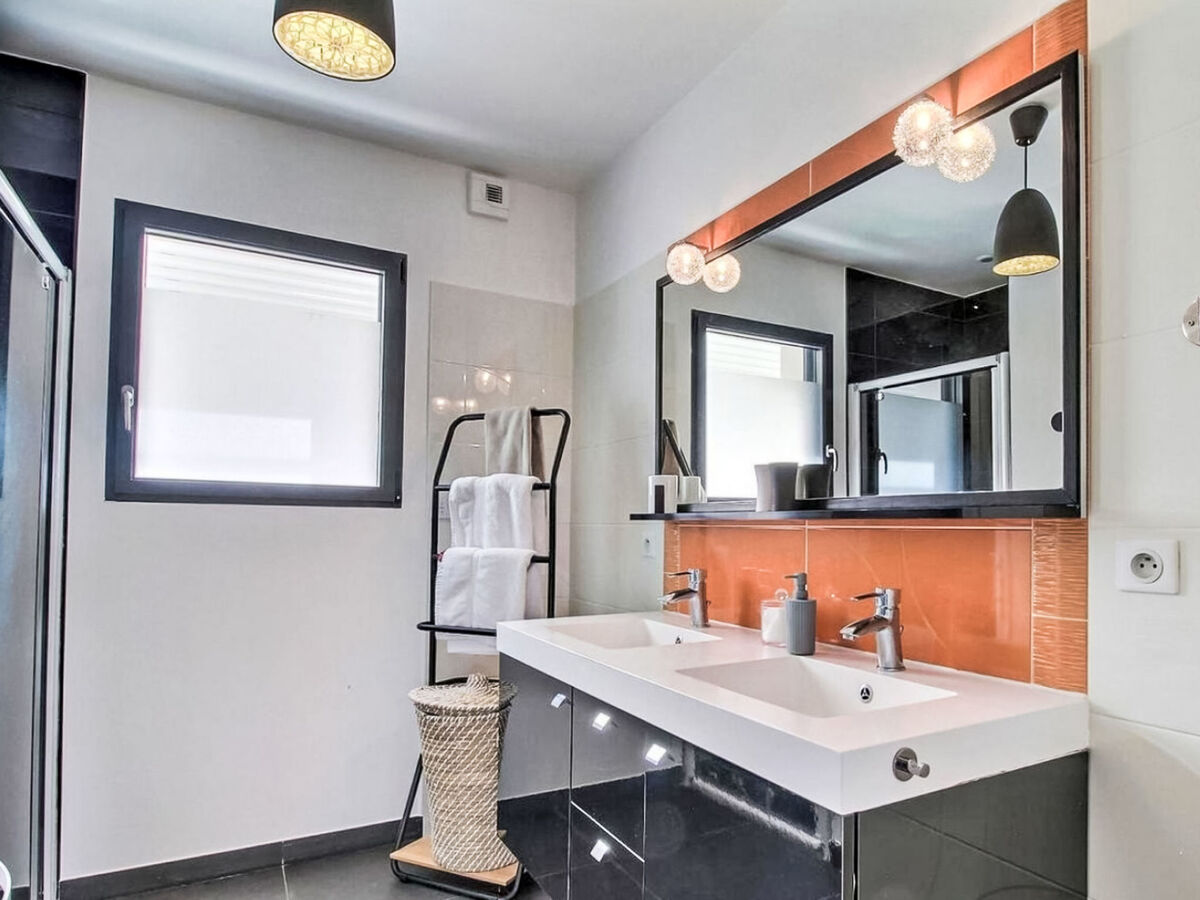 1 chambre avec 1 grand-lit (1 x 160 cm, longueur 200 cm), douche et double vasque.