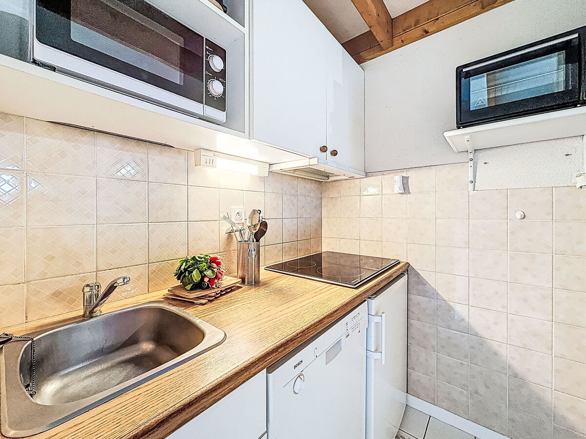 Coin cuisine (mini-four, four, lave-vaisselle, 3 plaques à induction, grille-pain, bouilloire électrique, micro-ondes, cafetière électrique).
