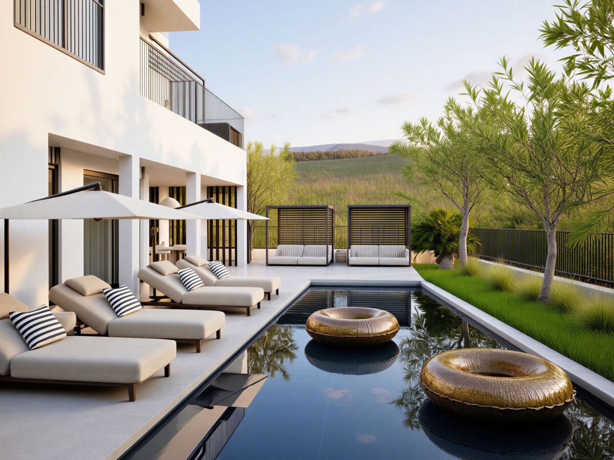 Sortie sur la terrasse, sur la piscine.