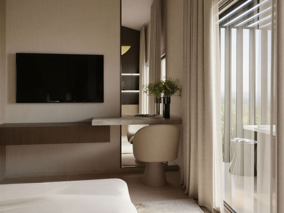 1 chambre avec 1 grand-lit (200 cm, longueur 200 cm), douche/WC, TV (satellite) et air-conditionné.