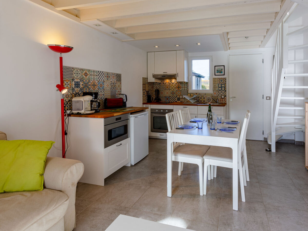 Coin cuisine (four, 2 plaques vitrocéramiques, grille-pain, bouilloire électrique, micro-ondes, cafetière électrique) avec table pour les repas.