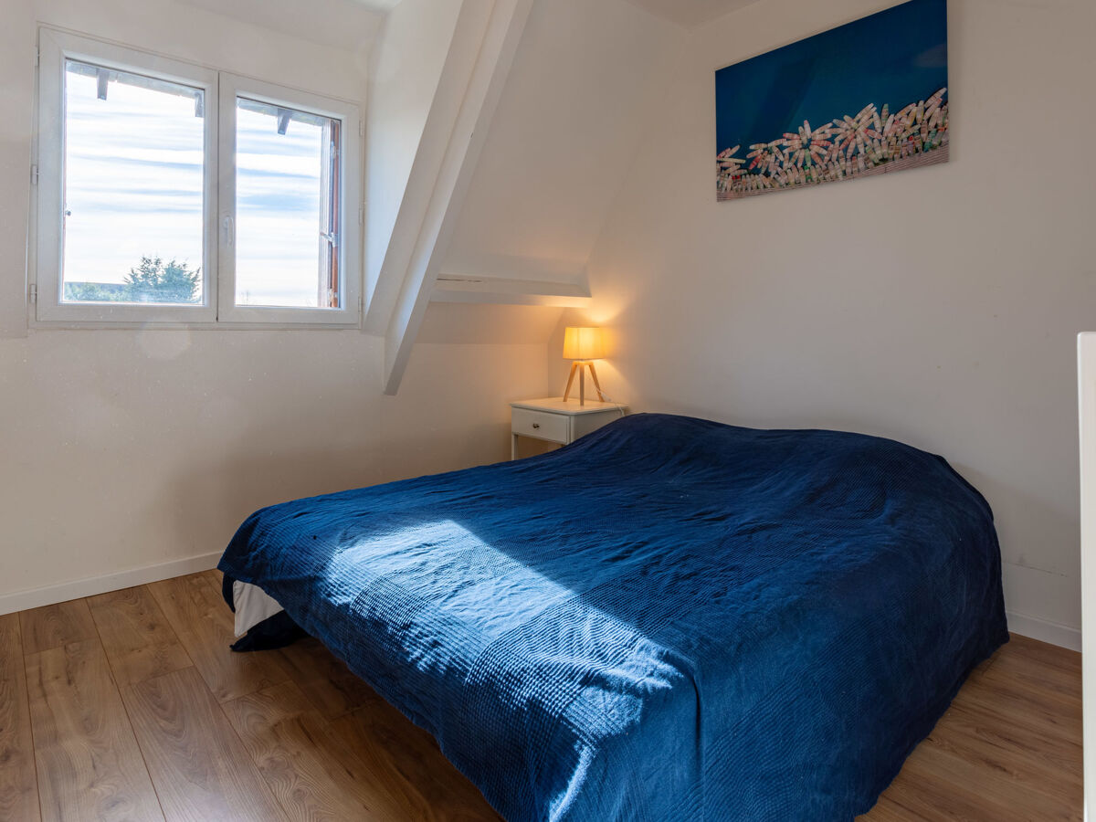 À l'étage supérieur: 1 chambre, mansardée avec 1 grand-lit (140 cm, longueur 190 cm).