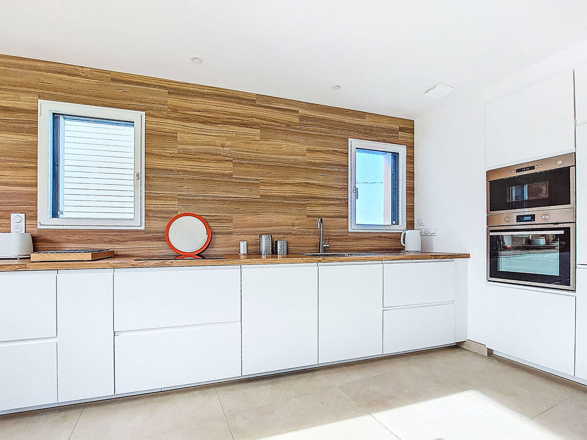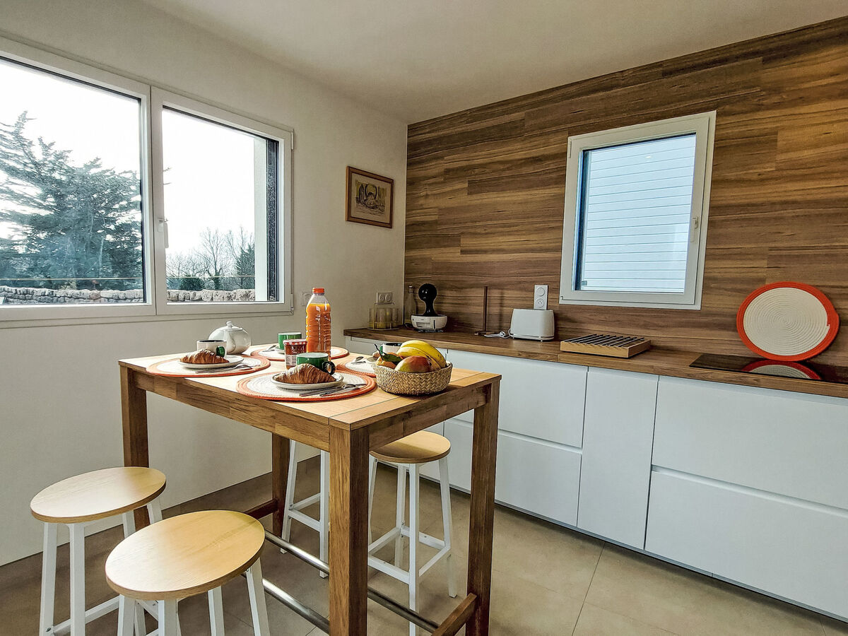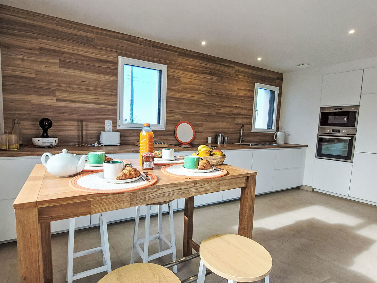 Grande cuisine ouverte (four, lave-vaisselle, 3 plaques à induction, grille-pain, bouilloire électrique, micro-ondes, congélateur, cafetière électrique) avec table pour les repas.