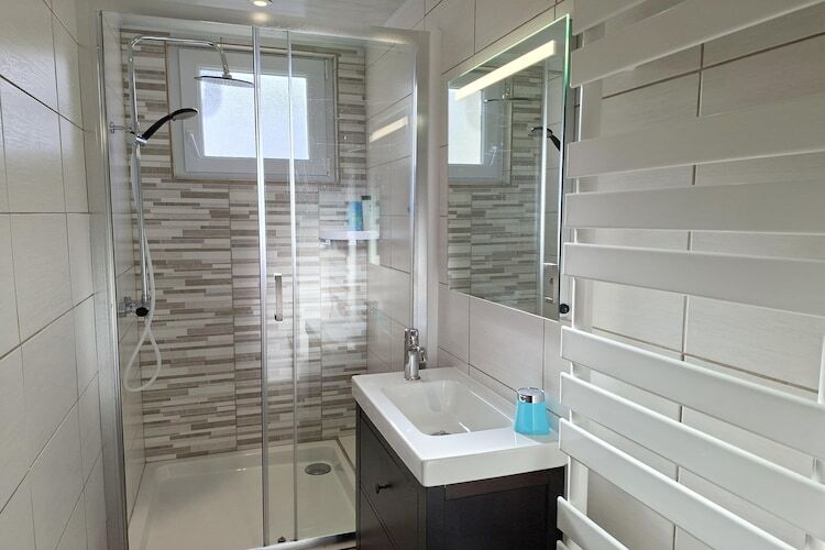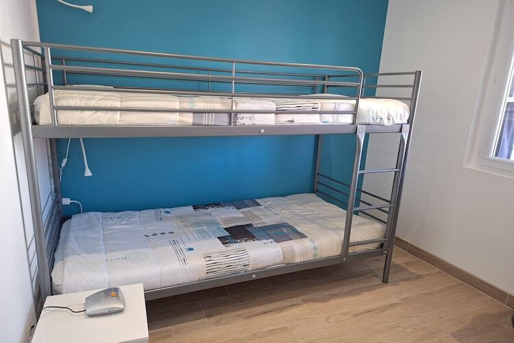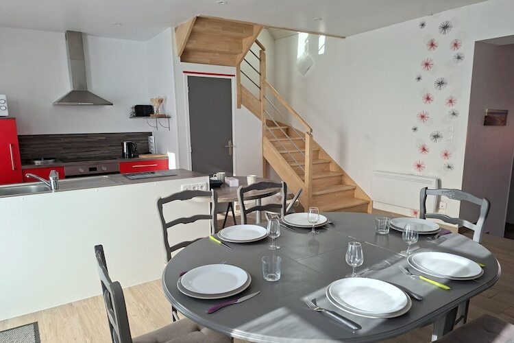 Au rez-de-chaussée, la cuisine ouverte est équipée d'une machine à café, d'un lave-vaisselle et d'un réfrigérateur, pour préparer facilement tous les repas. Le séjour/salle à manger attenant, avec son canapé-lit deux places, sa télévision et sa table à manger, crée un espace convivial pour se détendre après une journée à la mer. Une salle de bain moderne complète ce niveau, tandis qu'une chambre avec lits superposés offre un coin nuit douillet pour les enfants. À l'étage, sous les combles, une chambre double lumineuse offre un refuge plus intime, créant une atmosphère chaleureuse et reposante.