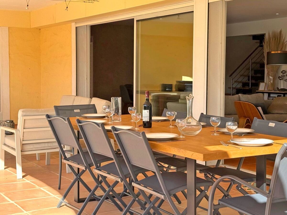 Une belle terrasse couverte à l'avant de la villa permet de prendre les repas à l'abri du soleil tout en profitant du cadre de vue exceptionnel.