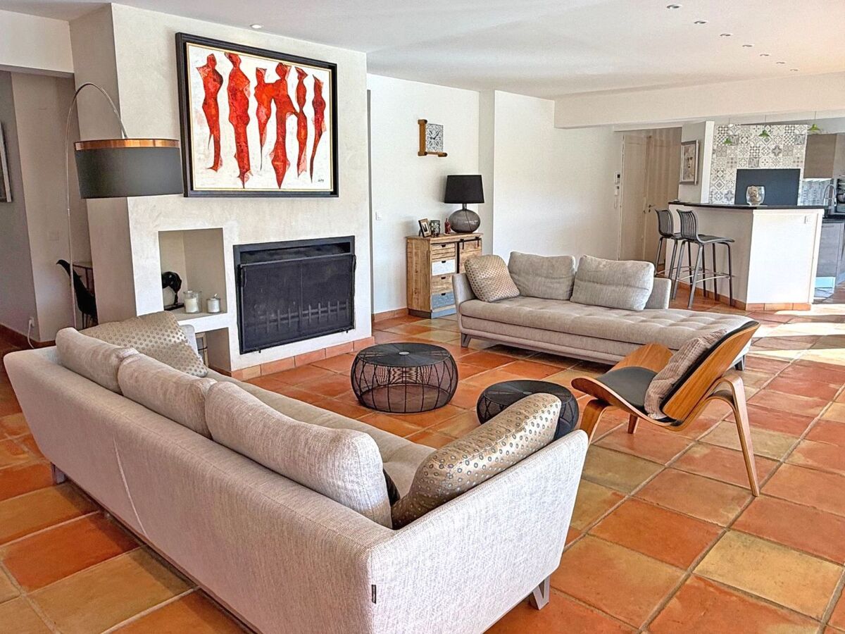 - Salon climatisé avec canapés et fauteuils, cheminée décorative et écran de télévision.