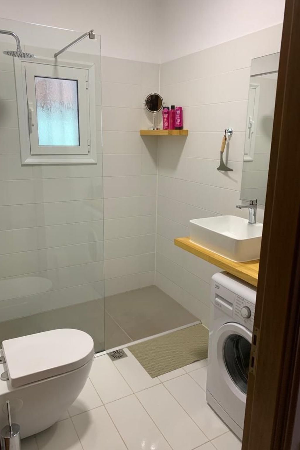 Washing machine in the bathroom, microwave-oven combo, iron and ironing board, bed linen, towels.