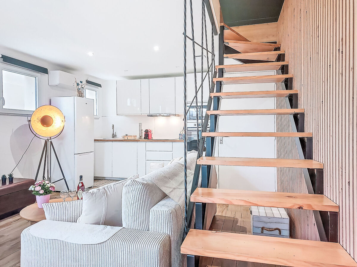 À l'étage supérieur: 1 chambre avec 1 grand-lit (1 x 160 cm, longueur 200 cm).